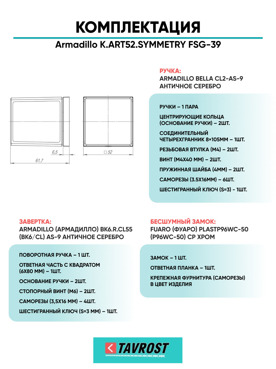 Комплект: Ручки Armadillo K.ART52.SYMMETRY FSG-39+Завертка+Бесшумн замок Fuaro/флорентийское золото