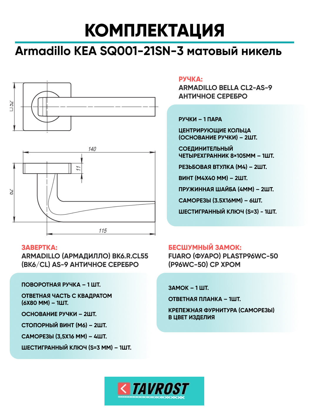 Комплект: Ручки Armadillo KEA SQ001-21SN-3+Завертка+Бесшумный замок Fuaro/матовый никель