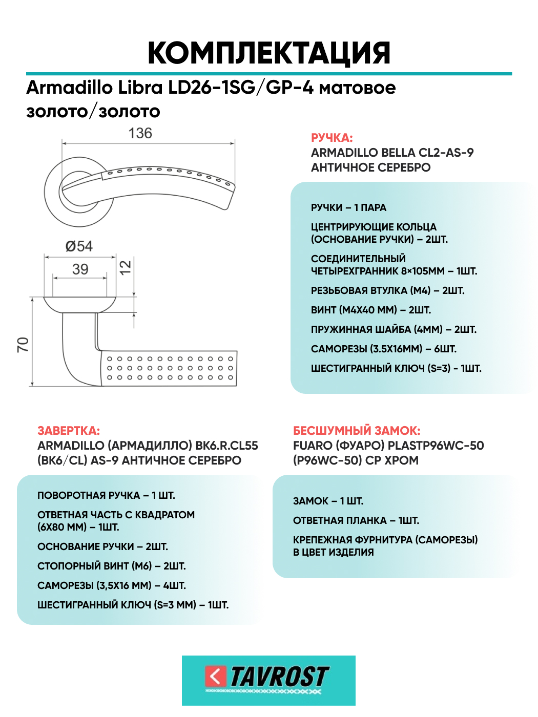 Комплект: Ручки Armadillo Libra LD26-1SG/GP-4+Завертка+Бесшумный замок Fuaro/матовое золото/золото