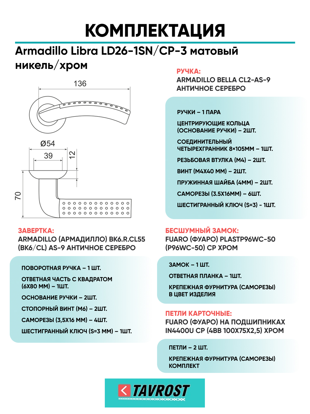 Комплект: Ручки Armadillo Libra LD26-1SN/CP-3+Завертка+Бесшумн замок и Петли Fuaro/матов никель/хром