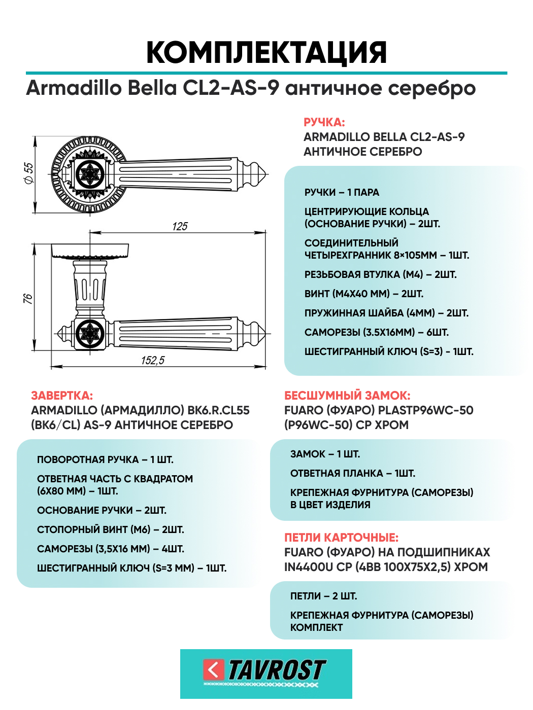 Комплект: Ручки Armadillo Matador CL4-Silver-925+Завертка+Бесшумный замок и Петли Fuaro/серебро 925