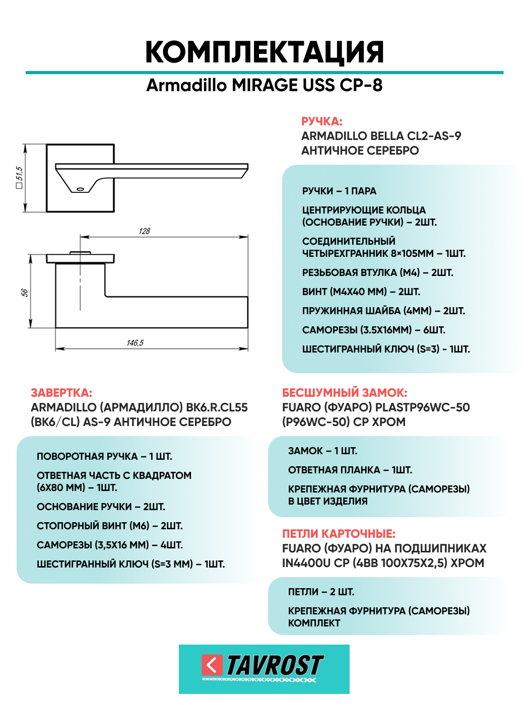 Комплект: Ручки Armadillo MIRAGE USS CP-8+Завертка+Бесшумный замок и Петли Fuaro/хром