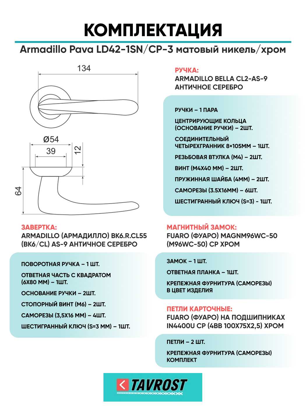 Комплект: Ручки Armadillo Pava LD42-1SN/CP-3+Завертка+Магн замок и Петли Fuaro/матовый никель/хром