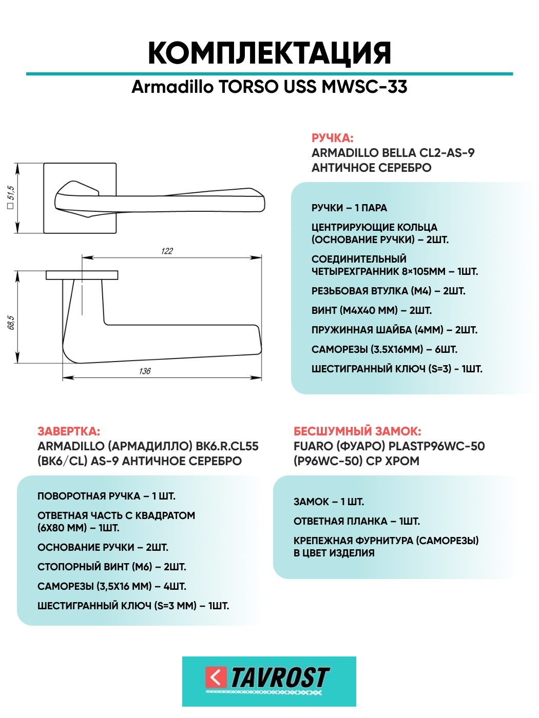 Комплект: Ручки Armadillo TORSO USS MWSC-33+Завертка+Бесшумный замок Fuaro/итальянский тисненый