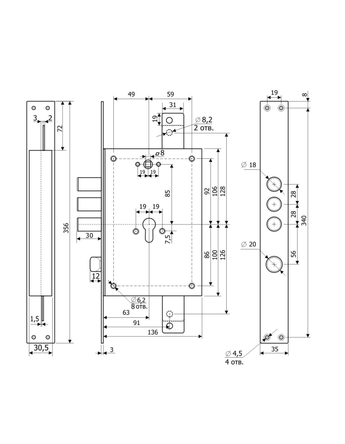 Размер ригеля 18 мм, Межосевое расстояние 85 мм, Вылет ригеля 30 ммХарактеристики