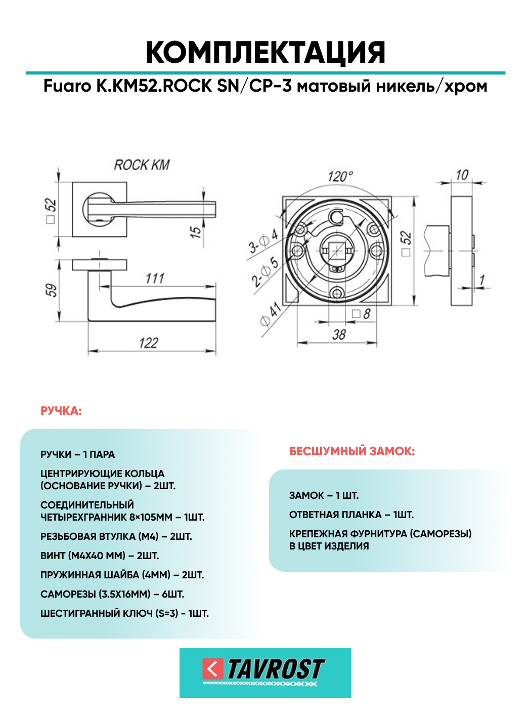 Ручка дверная межкомнатная:Прямые линии, безупречная эргономика и лаконичный дизайн в стиле hi-tech свойственны дверным ручкам серии KM. Дверная ручка на раздельном основании Fuaro ROCK KM на квадратном основании подходит для установки на внутренние входные и межкомнатные двери. Максимальная масса двери 60 кг. Посадочные размеры оснований совместимы со всеми типами межкомнатных механизмов. Материал изготовления: ZAMAK (сплав цинка, алюминия, магния и меди). Гальваническое покрытие прошло тест на устойчивость к коррозии в соляном тумане - более 96 часов. Ресурс работы дверных ручек более 150 000 циклов открывания/закрывания, что гарантирует безотказную работу двери более чем на 10 лет. Стяжные винты в комплекте обеспечивают более прочное крепление на полотне двери, подходят для установки на двери толщиной 35-55 мм. Цвет: матовый никель/хром. В комплект входят: стяжные винты, соединительный квадрат 8x105 мм, саморезы, фиксирующие винты, шестигранник.