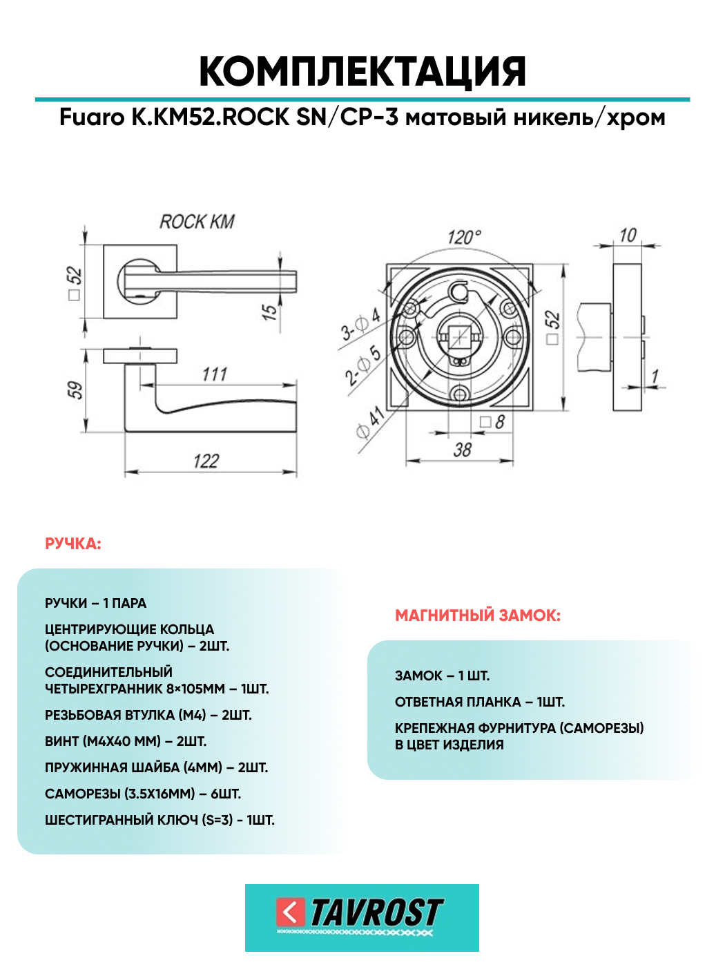 Ручка дверная межкомнатная:Прямые линии, безупречная эргономика и лаконичный дизайн в стиле hi-tech свойственны дверным ручкам серии KM. Дверная ручка на раздельном основании Fuaro ROCK KM на квадратном основании подходит для установки на внутренние входные и межкомнатные двери. Максимальная масса двери 60 кг. Посадочные размеры оснований совместимы со всеми типами межкомнатных механизмов. Материал изготовления: ZAMAK (сплав цинка, алюминия, магния и меди). Гальваническое покрытие прошло тест на устойчивость к коррозии в соляном тумане - более 96 часов. Ресурс работы дверных ручек более 150 000 циклов открывания/закрывания, что гарантирует безотказную работу двери более чем на 10 лет. Стяжные винты в комплекте обеспечивают более прочное крепление на полотне двери, подходят для установки на двери толщиной 35-55 мм. Цвет: матовый никель/хром. В комплект входят: стяжные винты, соединительный квадрат 8x105 мм, саморезы, фиксирующие винты, шестигранник.