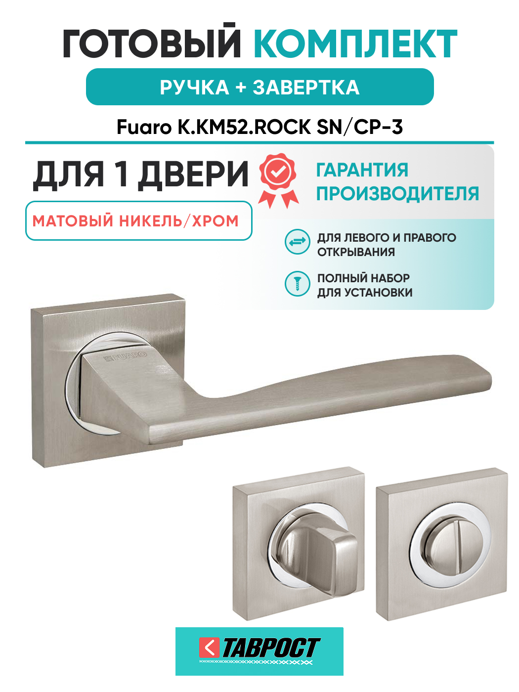 Ручка дверная межкомнатная:Прямые линии, безупречная эргономика и лаконичный дизайн в стиле hi-tech свойственны дверным ручкам серии KM. Дверная ручка на раздельном основании Fuaro ROCK KM на квадратном основании подходит для установки на внутренние входные и межкомнатные двери. Максимальная масса двери 60 кг. Посадочные размеры оснований совместимы со всеми типами межкомнатных механизмов. Материал изготовления: ZAMAK (сплав цинка, алюминия, магния и меди). Гальваническое покрытие прошло тест на устойчивость к коррозии в соляном тумане - более 96 часов. Ресурс работы дверных ручек более 150 000 циклов открывания/закрывания, что гарантирует безотказную работу двери более чем на 10 лет. Стяжные винты в комплекте обеспечивают более прочное крепление на полотне двери, подходят для установки на двери толщиной 35-55 мм. Цвет: матовый никель/хром. В комплект входят: стяжные винты, соединительный квадрат 8x105 мм, саморезы, фиксирующие винты, шестигранник.