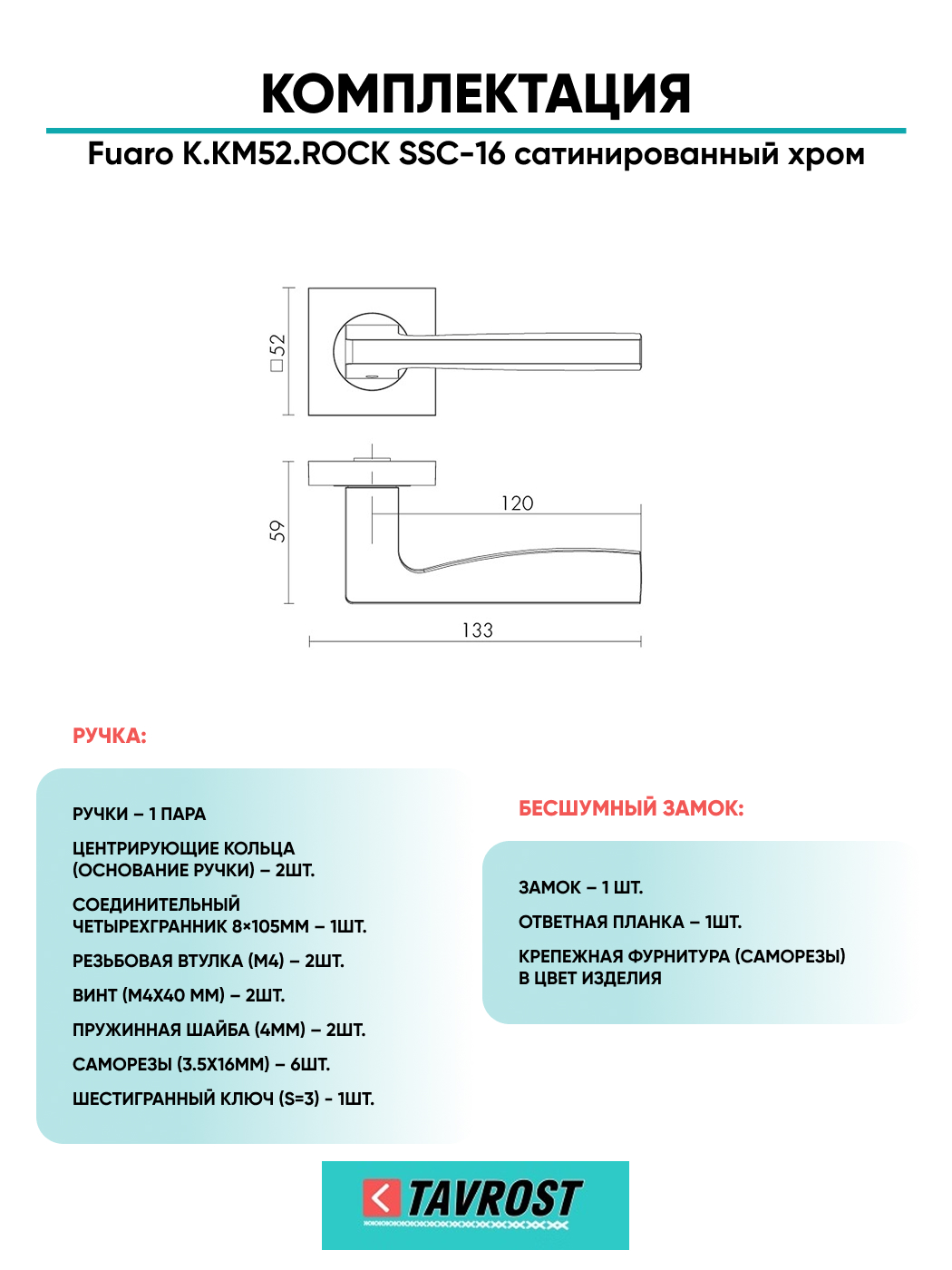 Ручка дверная межкомнатная:Прямые линии, безупречная эргономика и лаконичный дизайн в стиле hi-tech свойственны дверным ручкам серии KM. Дверная ручка на раздельном основании Fuaro ROCK KM на квадратном основании подходит для установки на внутренние входные и межкомнатные двери. Максимальная масса двери 60 кг. Посадочные размеры оснований совместимы со всеми типами межкомнатных механизмов. Материал изготовления: ZAMAK (сплав цинка, алюминия, магния и меди). Гальваническое покрытие прошло тест на устойчивость к коррозии в соляном тумане - более 96 часов. Ресурс работы дверных ручек более 150 000 циклов открывания/закрывания, что гарантирует безотказную работу двери более чем на 10 лет. Стяжные винты в комплекте обеспечивают более прочное крепление на полотне двери, подходят для установки на двери толщиной 35-55 мм. В комплект входят: стяжные винты, соединительный квадрат 8x105 мм, саморезы, фиксирующие винты, шестигранник.