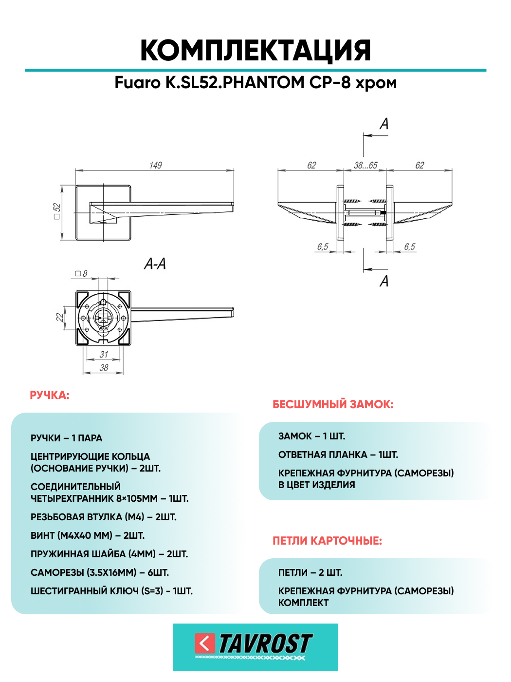 =this.property.NAME_2 (страна производства Китай , тип конструкции: ), выпускается в заводских условиях, с соблюдением всех технологических требований производства и контролем на всех этапах производства. Ручка изготовлена из материала , который широко используется при производстве дверной фурнитуры, в цвете хром. Ручки выполнены в стиле , Комплекты, что придаст межкомнатным дверям свою индивидуальность. Ручки продаются комплектами и подходят для дверей левого и правого открывания. В комплекте содержится полный набор для установки на одну дверь (соединительный штифт, шурупы и т.д). Размеры ручки: длина , ширина , высота . Вся продукция производителя Фуаро обладает проверенным временем качеством, подкрепленным заводской гарантией.