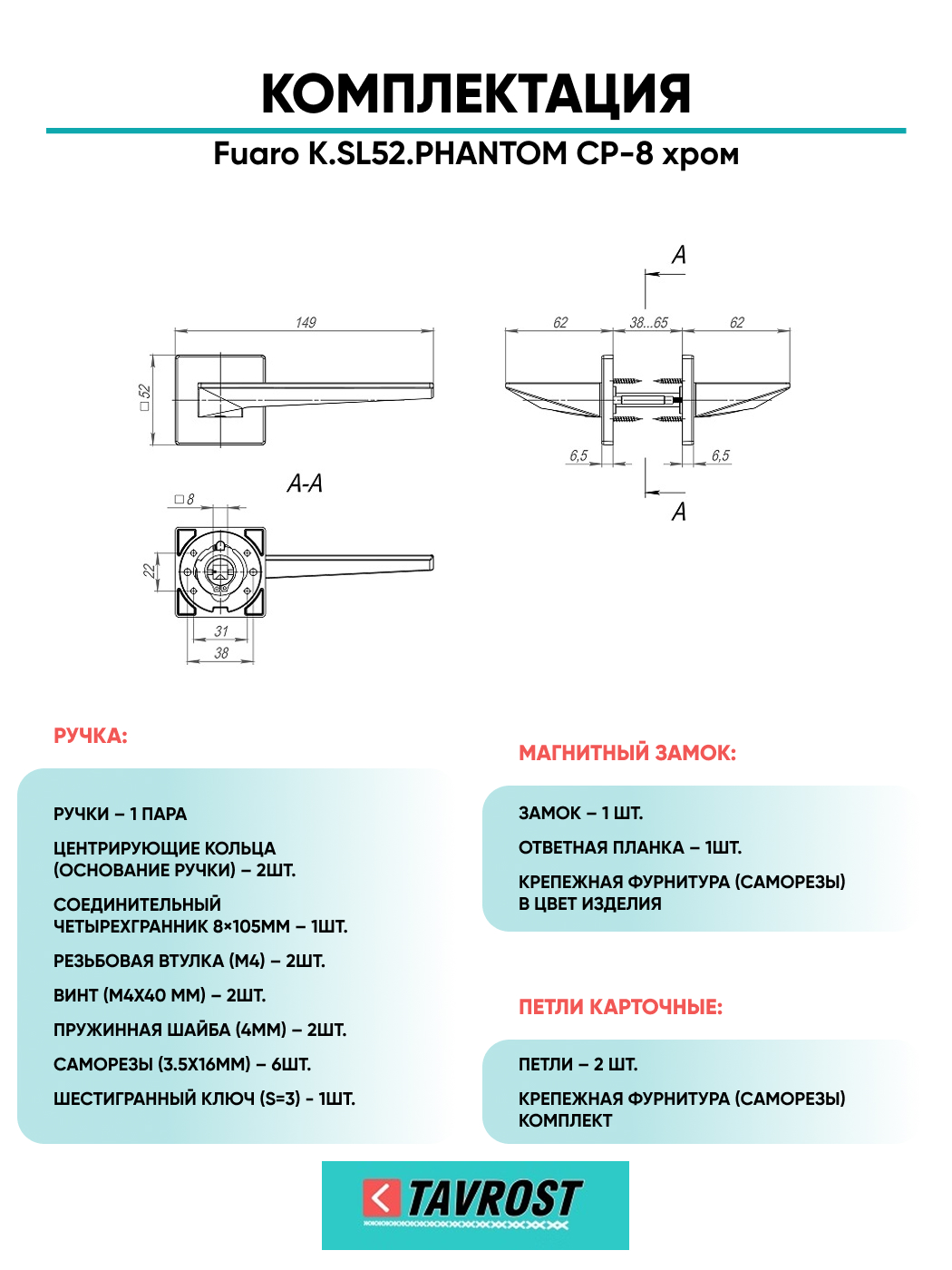 =this.property.NAME_2 (страна производства Китай , тип конструкции: ), выпускается в заводских условиях, с соблюдением всех технологических требований производства и контролем на всех этапах производства. Ручка изготовлена из материала , который широко используется при производстве дверной фурнитуры, в цвете хром. Ручки выполнены в стиле , Комплекты, что придаст межкомнатным дверям свою индивидуальность. Ручки продаются комплектами и подходят для дверей левого и правого открывания. В комплекте содержится полный набор для установки на одну дверь (соединительный штифт, шурупы и т.д). Размеры ручки: длина , ширина , высота . Вся продукция производителя Фуаро обладает проверенным временем качеством, подкрепленным заводской гарантией.