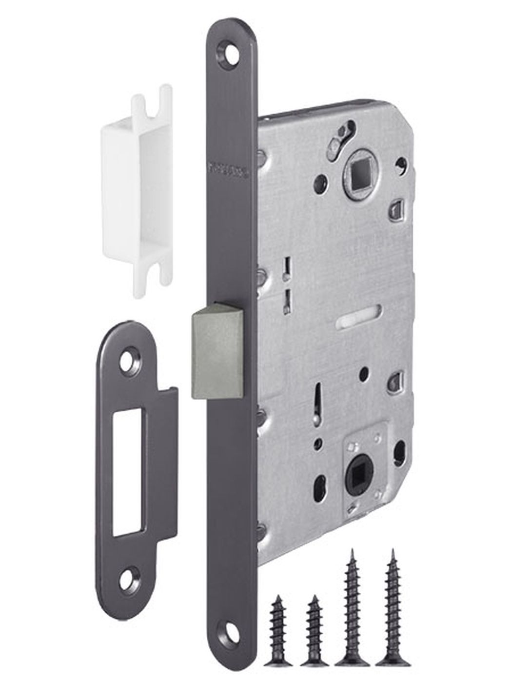 Дверная защелка с пластиковым механизмом Fuaro P96WC серии PLASTIC изготовлена в соответствии с требованиями ГОСТ 5089-2003. Предназначена для установки в деревянные межкомнатные и сантехнические двери. Легкая смена направления язычка защелки, подходит для дверей левого и правого открывания. Корпус выполнен из стали с надежным гальваническим покрытием. Ударопрочный пластиковый механизм обеспечивает бесшумность работы защелки. Защелка P96WC с усиленным блоком пружин имеет высший 4 класс надежности (250 000 циклов открывания/закрывания). Отверстия под стяжные винты находятся на расстоянии 38 мм. Размер бэксета - 50 мм. Размер межосевого расстояния - 96 мм. Возможна установка дверных ручек на стяжные винты для более прочного крепления. Цвет: графит. В комплектацию входят: ответная планка и крепежная фурнитура в цвет изделия.