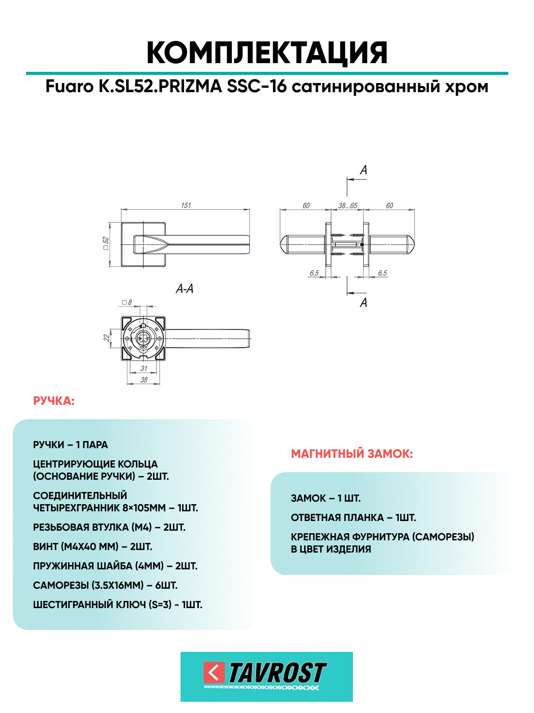 Ручка дверная Fuaro (Фуаро) межкомнатная K.SL52.PRIZMA (PRIZMA SL) SSC-16 сатинированный хром Набор 6