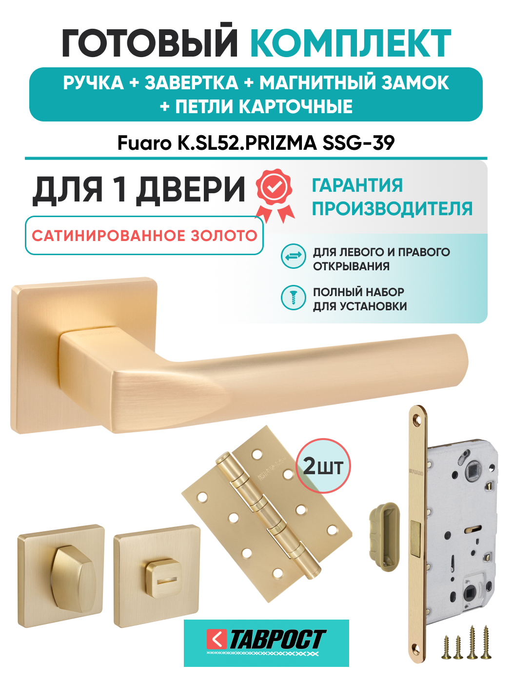 =this.property.NAME_2 (страна производства Китай , тип конструкции: ), выпускается в заводских условиях, с соблюдением всех технологических требований производства и контролем на всех этапах производства. Ручка изготовлена из материала , который широко используется при производстве дверной фурнитуры, в цвете Сатинированное золото. Ручки выполнены в стиле , Комплекты, что придаст межкомнатным дверям свою индивидуальность. Ручки продаются комплектами и подходят для дверей левого и правого открывания. В комплекте содержится полный набор для установки на одну дверь (соединительный штифт, шурупы и т.д). Размеры ручки: длина , ширина , высота . Вся продукция производителя Фуаро обладает проверенным временем качеством, подкрепленным заводской гарантией.