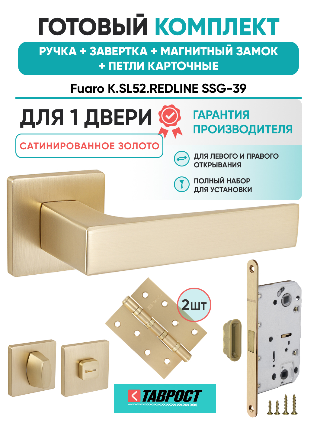 =this.property.NAME_2 (страна производства Китай , тип конструкции: ), выпускается в заводских условиях, с соблюдением всех технологических требований производства и контролем на всех этапах производства. Ручка изготовлена из материала , который широко используется при производстве дверной фурнитуры, в цвете Золото сатинированное. Ручки выполнены в стиле , Комплекты, что придаст межкомнатным дверям свою индивидуальность. Ручки продаются комплектами и подходят для дверей левого и правого открывания. В комплекте содержится полный набор для установки на одну дверь (соединительный штифт, шурупы и т.д). Размеры ручки: длина , ширина , высота . Вся продукция производителя Фуаро обладает проверенным временем качеством, подкрепленным заводской гарантией.