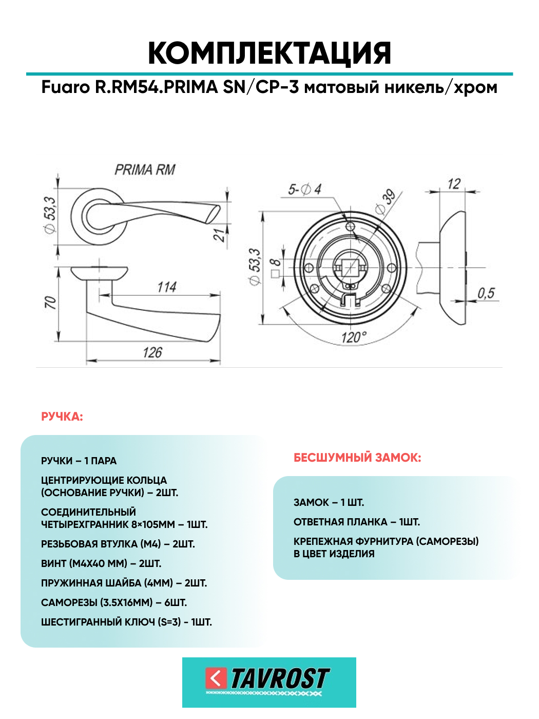 Ручка дверная межкомнатная:Ритм, линии, изгибы рождают новые формы. Безупречная эргономика и лаконичный дизайн делают дверные ручки серии RM (Ritmo) центральным элементом двери. Дверная ручка на раздельном основании Fuaro PRIMA RM на круглом основании подходит для установки на внутренние входные и межкомнатные двери. Максимальная масса двери 60 кг. Посадочные размеры оснований совместимы со всеми типами межкомнатных механизмов. Материал изготовления: ZAMAK (сплав цинка, алюминия, магния и меди). Гальваническое покрытие прошло тест на устойчивость к коррозии в соляном тумане - более 96 часов. Ресурс работы дверных ручек более 150 000 циклов открывания/закрывания, что гарантирует безотказную работу двери более чем на 10 лет. Стяжные винты в комплекте обеспечивают более прочное крепление на полотне двери, подходят для установки на двери толщиной 35-55 мм. Цвет: матовый никель/хром. В комплект входят: стяжные винты, соединительный квадрат 8x105 мм, саморезы, фиксирующие винты, шестигранник.