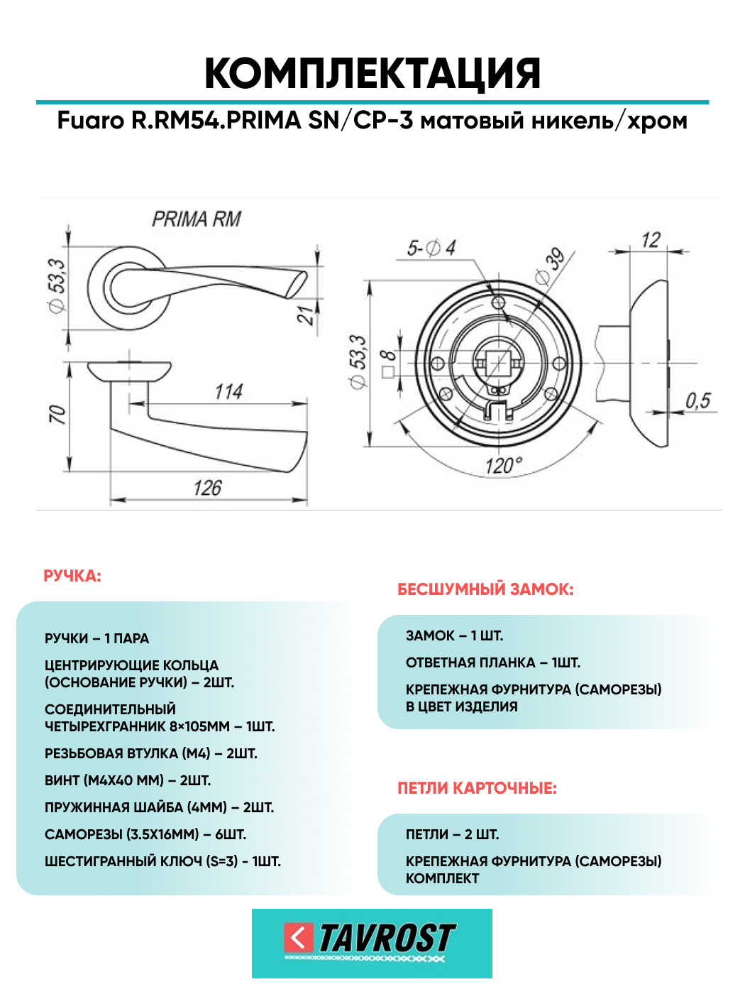 Ручка дверная межкомнатная:Ритм, линии, изгибы рождают новые формы. Безупречная эргономика и лаконичный дизайн делают дверные ручки серии RM (Ritmo) центральным элементом двери. Дверная ручка на раздельном основании Fuaro PRIMA RM на круглом основании подходит для установки на внутренние входные и межкомнатные двери. Максимальная масса двери 60 кг. Посадочные размеры оснований совместимы со всеми типами межкомнатных механизмов. Материал изготовления: ZAMAK (сплав цинка, алюминия, магния и меди). Гальваническое покрытие прошло тест на устойчивость к коррозии в соляном тумане - более 96 часов. Ресурс работы дверных ручек более 150 000 циклов открывания/закрывания, что гарантирует безотказную работу двери более чем на 10 лет. Стяжные винты в комплекте обеспечивают более прочное крепление на полотне двери, подходят для установки на двери толщиной 35-55 мм. Цвет: матовый никель/хром. В комплект входят: стяжные винты, соединительный квадрат 8x105 мм, саморезы, фиксирующие винты, шестигранник.