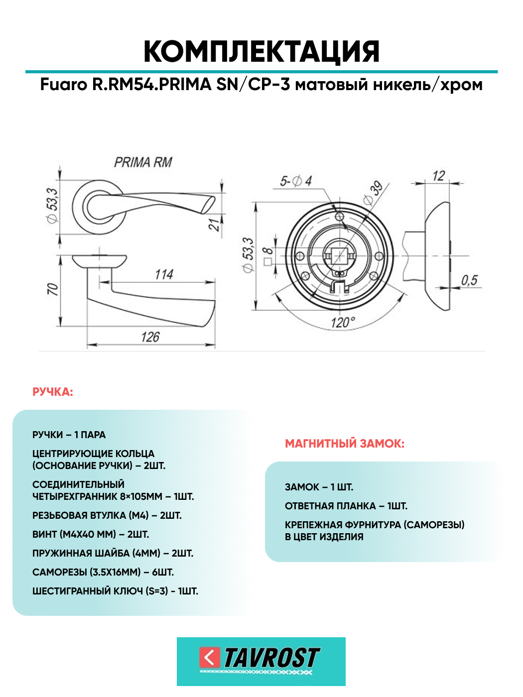 Ручка дверная межкомнатная:Ритм, линии, изгибы рождают новые формы. Безупречная эргономика и лаконичный дизайн делают дверные ручки серии RM (Ritmo) центральным элементом двери. Дверная ручка на раздельном основании Fuaro PRIMA RM на круглом основании подходит для установки на внутренние входные и межкомнатные двери. Максимальная масса двери 60 кг. Посадочные размеры оснований совместимы со всеми типами межкомнатных механизмов. Материал изготовления: ZAMAK (сплав цинка, алюминия, магния и меди). Гальваническое покрытие прошло тест на устойчивость к коррозии в соляном тумане - более 96 часов. Ресурс работы дверных ручек более 150 000 циклов открывания/закрывания, что гарантирует безотказную работу двери более чем на 10 лет. Стяжные винты в комплекте обеспечивают более прочное крепление на полотне двери, подходят для установки на двери толщиной 35-55 мм. Цвет: матовый никель/хром. В комплект входят: стяжные винты, соединительный квадрат 8x105 мм, саморезы, фиксирующие винты, шестигранник.