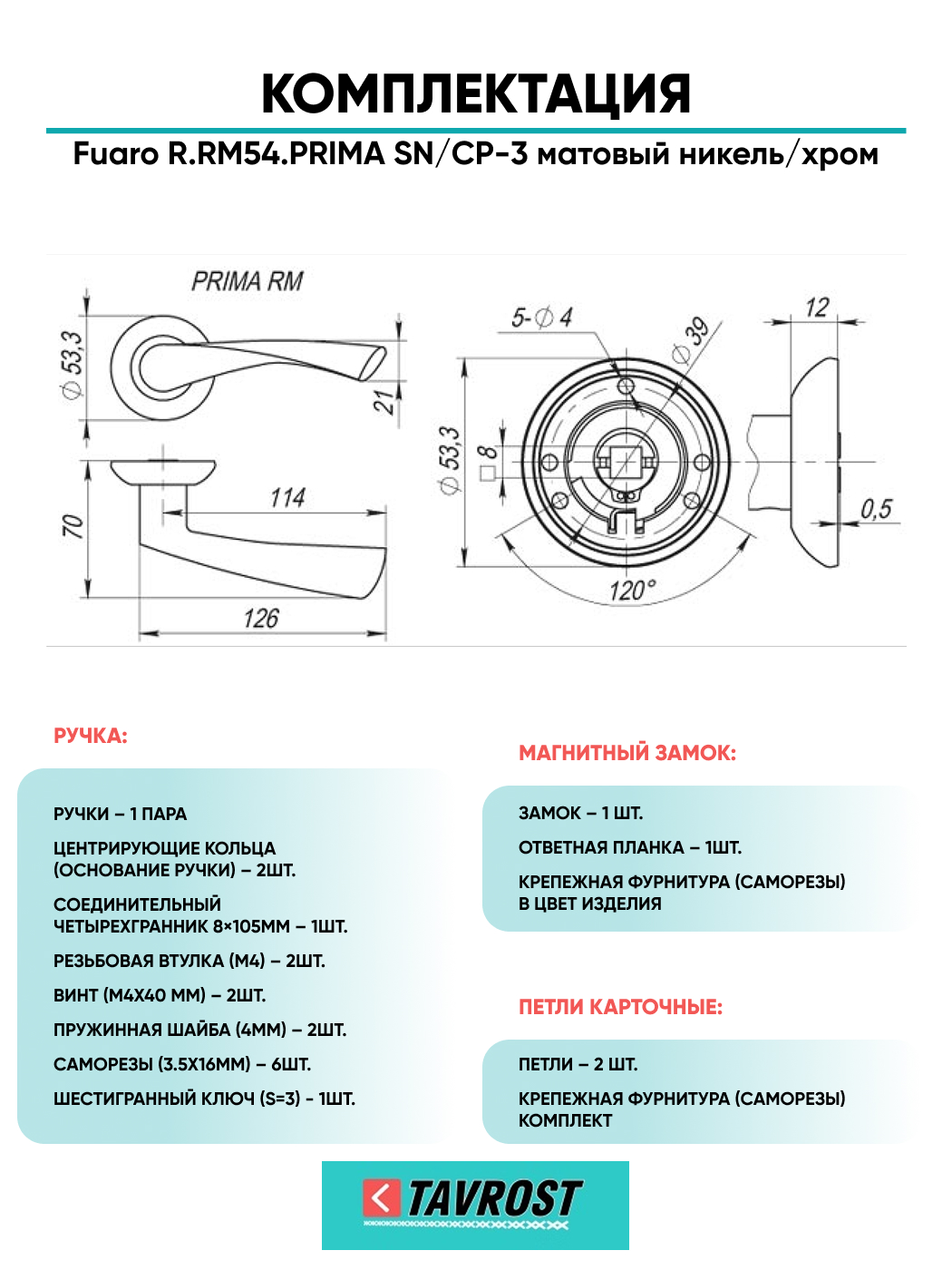 Ручка дверная межкомнатная:Ритм, линии, изгибы рождают новые формы. Безупречная эргономика и лаконичный дизайн делают дверные ручки серии RM (Ritmo) центральным элементом двери. Дверная ручка на раздельном основании Fuaro PRIMA RM на круглом основании подходит для установки на внутренние входные и межкомнатные двери. Максимальная масса двери 60 кг. Посадочные размеры оснований совместимы со всеми типами межкомнатных механизмов. Материал изготовления: ZAMAK (сплав цинка, алюминия, магния и меди). Гальваническое покрытие прошло тест на устойчивость к коррозии в соляном тумане - более 96 часов. Ресурс работы дверных ручек более 150 000 циклов открывания/закрывания, что гарантирует безотказную работу двери более чем на 10 лет. Стяжные винты в комплекте обеспечивают более прочное крепление на полотне двери, подходят для установки на двери толщиной 35-55 мм. Цвет: матовый никель/хром. В комплект входят: стяжные винты, соединительный квадрат 8x105 мм, саморезы, фиксирующие винты, шестигранник.