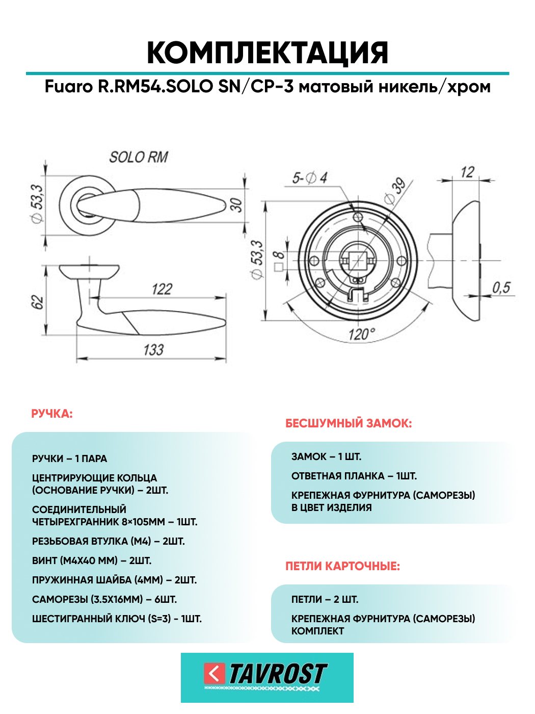 Ручка дверная межкомнатная:Ритм, линии, изгибы рождают новые формы. Безупречная эргономика и лаконичный дизайн делают дверные ручки серии RM (Ritmo) центральным элементом двери. Дверная ручка на раздельном основании Fuaro SOLO RM на круглом основании подходит для установки на внутренние входные и межкомнатные двери. Максимальная масса двери 60 кг. Посадочные размеры оснований совместимы со всеми типами межкомнатных механизмов. Материал изготовления: ZAMAK (сплав цинка, алюминия, магния и меди). Гальваническое покрытие прошло тест на устойчивость к коррозии в соляном тумане - более 96 часов. Ресурс работы дверных ручек более 150 000 циклов открывания/закрывания, что гарантирует безотказную работу двери более чем на 10 лет. Стяжные винты в комплекте обеспечивают более прочное крепление на полотне двери, подходят для установки на двери толщиной 35-55 мм. Цвет: матовый никель/хром. В комплект входят: стяжные винты, соединительный квадрат 8x105 мм, саморезы, фиксирующие винты, шестигранник.
