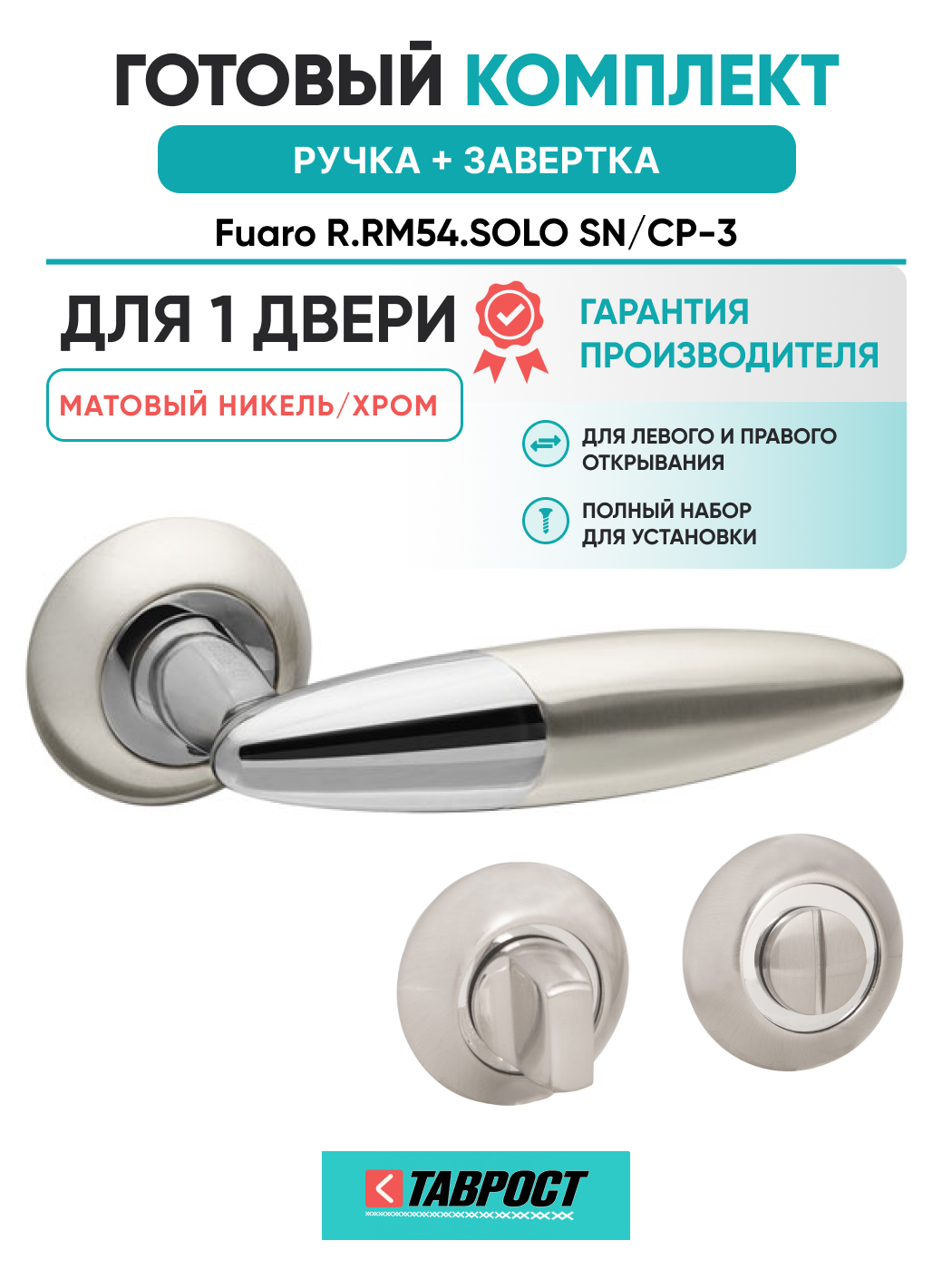 Ручка дверная межкомнатная:Ритм, линии, изгибы рождают новые формы. Безупречная эргономика и лаконичный дизайн делают дверные ручки серии RM (Ritmo) центральным элементом двери. Дверная ручка на раздельном основании Fuaro SOLO RM на круглом основании подходит для установки на внутренние входные и межкомнатные двери. Максимальная масса двери 60 кг. Посадочные размеры оснований совместимы со всеми типами межкомнатных механизмов. Материал изготовления: ZAMAK (сплав цинка, алюминия, магния и меди). Гальваническое покрытие прошло тест на устойчивость к коррозии в соляном тумане - более 96 часов. Ресурс работы дверных ручек более 150 000 циклов открывания/закрывания, что гарантирует безотказную работу двери более чем на 10 лет. Стяжные винты в комплекте обеспечивают более прочное крепление на полотне двери, подходят для установки на двери толщиной 35-55 мм. Цвет: матовый никель/хром. В комплект входят: стяжные винты, соединительный квадрат 8x105 мм, саморезы, фиксирующие винты, шестигранник.