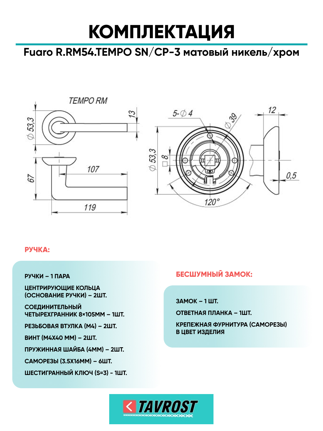 Ручка дверная межкомнатная:Ритм, линии, изгибы рождают новые формы. Безупречная эргономика и лаконичный дизайн делают дверные ручки серии RM (Ritmo) центральным элементом двери. Дверная ручка на раздельном основании Fuaro TEMPO RM на круглом основании подходит для установки на внутренние входные и межкомнатные двери. Максимальная масса двери 60 кг. Посадочные размеры оснований совместимы со всеми типами межкомнатных механизмов. Материал изготовления: ZAMAK (сплав цинка, алюминия, магния и меди). Гальваническое покрытие прошло тест на устойчивость к коррозии в соляном тумане - более 96 часов. Ресурс работы дверных ручек более 150 000 циклов открывания/закрывания, что гарантирует безотказную работу двери более чем на 10 лет. Стяжные винты в комплекте обеспечивают более прочное крепление на полотне двери, подходят для установки на двери толщиной 35-55 мм. Цвет: матовый никель/хром. В комплект входят: стяжные винты, соединительный квадрат 8x105 мм, саморезы, фиксирующие винты, шестигранник.