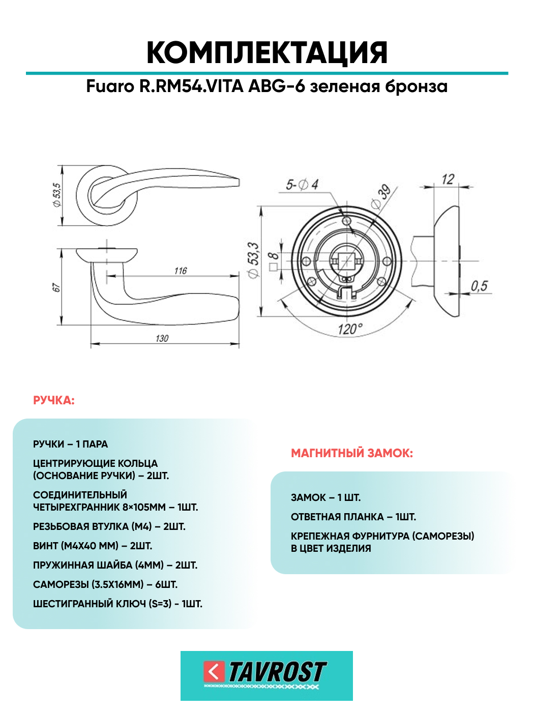 Ручка дверная межкомнатная:Ритм, линии, изгибы рождают новые формы. Безупречная эргономика и лаконичный дизайн делают дверные ручки серии RM (Ritmo) центральным элементом двери. Дверная ручка на раздельном основании Fuaro VITA RM на круглом основании подходит для установки на внутренние входные и межкомнатные двери. Максимальная масса двери 60 кг. Посадочные размеры оснований совместимы со всеми типами межкомнатных механизмов. Материал изготовления: ZAMAK (сплав цинка, алюминия, магния и меди). Гальваническое покрытие прошло тест на устойчивость к коррозии в соляном тумане - более 96 часов. Ресурс работы дверных ручек более 150 000 циклов открывания/закрывания, что гарантирует безотказную работу двери более чем на 10 лет. Стяжные винты в комплекте обеспечивают более прочное крепление на полотне двери, подходят для установки на двери толщиной 35-55 мм. Цвет: зеленая бронза. В комплект входят: стяжные винты, соединительный квадрат 8x105 мм, саморезы, фиксирующие винты, шестигранник.