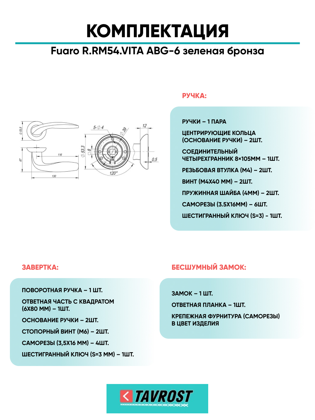 Ручка дверная межкомнатная:Ритм, линии, изгибы рождают новые формы. Безупречная эргономика и лаконичный дизайн делают дверные ручки серии RM (Ritmo) центральным элементом двери. Дверная ручка на раздельном основании Fuaro VITA RM на круглом основании подходит для установки на внутренние входные и межкомнатные двери. Максимальная масса двери 60 кг. Посадочные размеры оснований совместимы со всеми типами межкомнатных механизмов. Материал изготовления: ZAMAK (сплав цинка, алюминия, магния и меди). Гальваническое покрытие прошло тест на устойчивость к коррозии в соляном тумане - более 96 часов. Ресурс работы дверных ручек более 150 000 циклов открывания/закрывания, что гарантирует безотказную работу двери более чем на 10 лет. Стяжные винты в комплекте обеспечивают более прочное крепление на полотне двери, подходят для установки на двери толщиной 35-55 мм. Цвет: зеленая бронза. В комплект входят: стяжные винты, соединительный квадрат 8x105 мм, саморезы, фиксирующие винты, шестигранник.