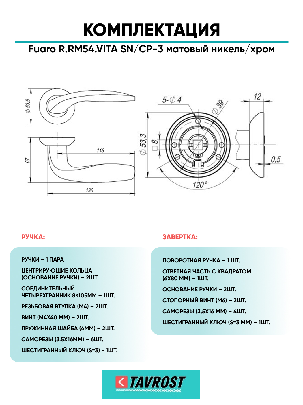 Ручка дверная межкомнатная:Ритм, линии, изгибы рождают новые формы. Безупречная эргономика и лаконичный дизайн делают дверные ручки серии RM (Ritmo) центральным элементом двери. Дверная ручка на раздельном основании Fuaro VITA RM на круглом основании подходит для установки на внутренние входные и межкомнатные двери. Максимальная масса двери 60 кг. Посадочные размеры оснований совместимы со всеми типами межкомнатных механизмов. Материал изготовления: ZAMAK (сплав цинка, алюминия, магния и меди). Гальваническое покрытие прошло тест на устойчивость к коррозии в соляном тумане - более 96 часов. Ресурс работы дверных ручек более 150 000 циклов открывания/закрывания, что гарантирует безотказную работу двери более чем на 10 лет. Стяжные винты в комплекте обеспечивают более прочное крепление на полотне двери, подходят для установки на двери толщиной 35-55 мм. Цвет: матовый никель/хром. В комплект входят: стяжные винты, соединительный квадрат 8x105 мм, саморезы, фиксирующие винты, шестигранник.