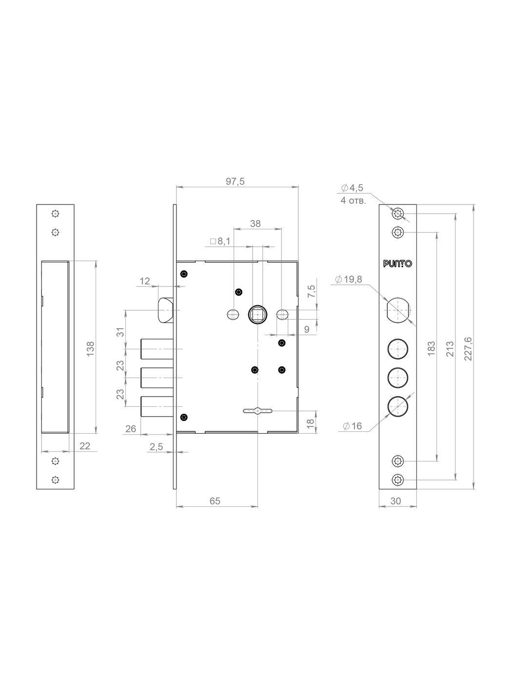 Замок Punto (Пунто) врезной сувальдный MDV30/S-65.77 CP хром (длинный ключ) тех.уп.