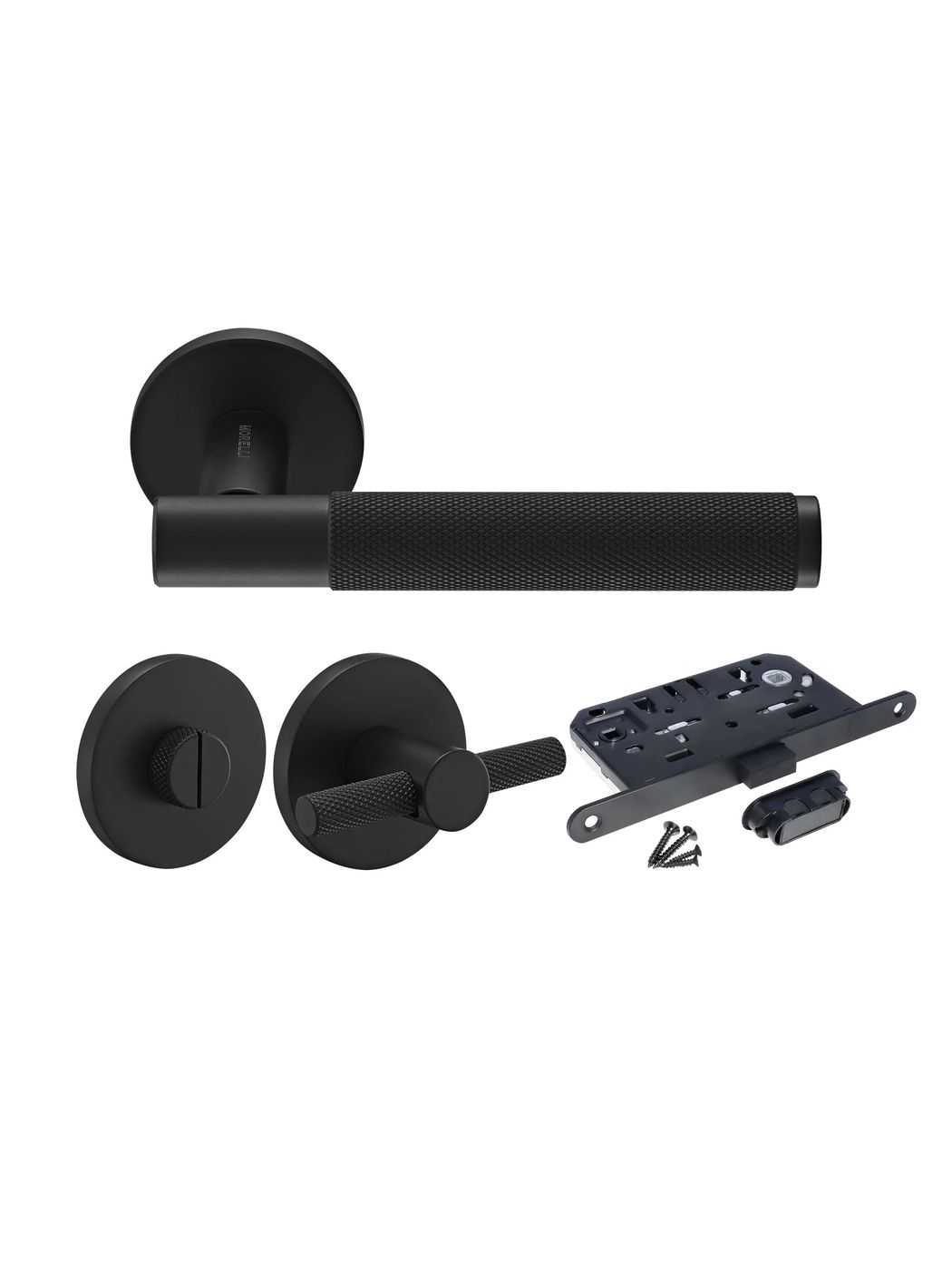 Комплект дверных ручек Morelli MH-57-R6T BL с заверткой MH-WC-R6T BL + магнитный замок M1895 BL, цвет черный