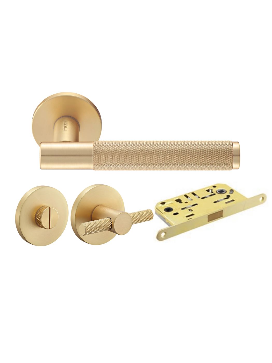 Комплект дверных ручек Morelli MH-57-R6T MSG с заверткой MH-WC-R6T MSG + магнитный замок M1895 MSG, цвет матовое золото