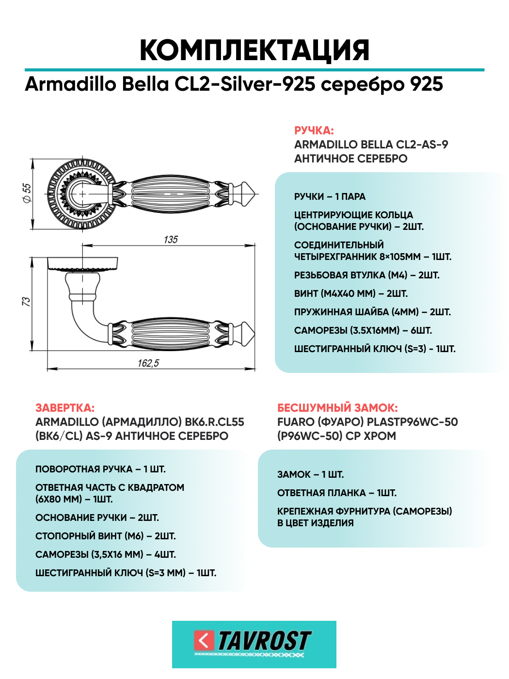 Комплект: Ручки Armadillo Bella CL2-Silver-925+Завертка+Бесшумный замок Fuaro/серебро 925