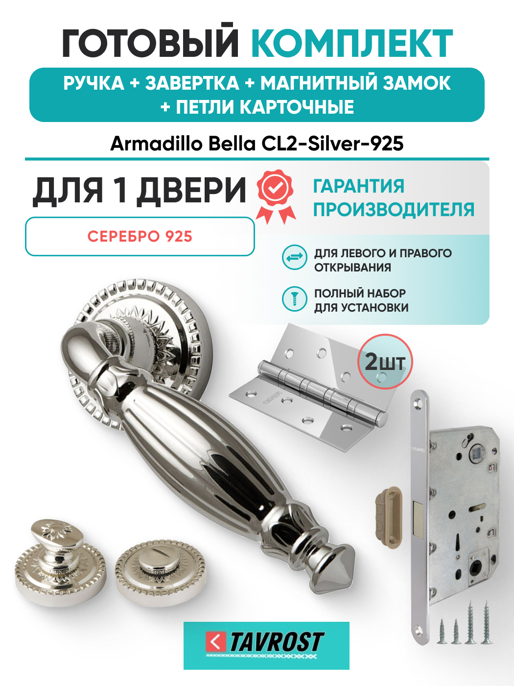 Комплект: Ручки Armadillo Bella CL2-Silver-925+Завертка+Магнитный замок и Петли Fuaro/серебро 925
