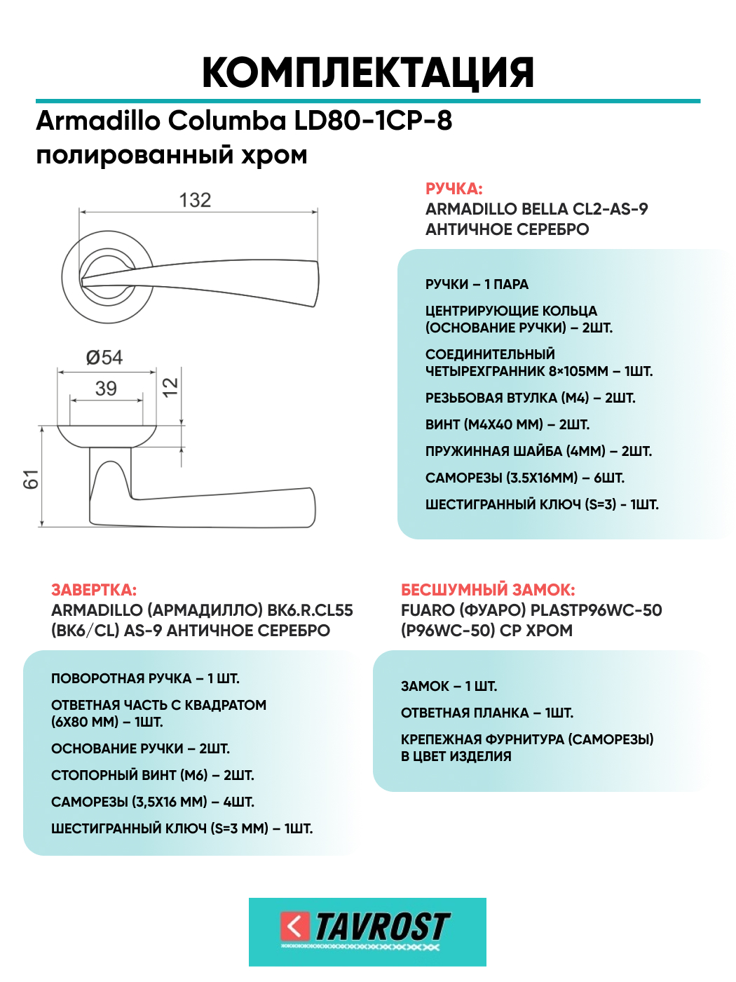 Комплект: Ручки Armadillo Columba LD80-1CP-8+Завертка+Бесшумный замок Fuaro/полированный хром