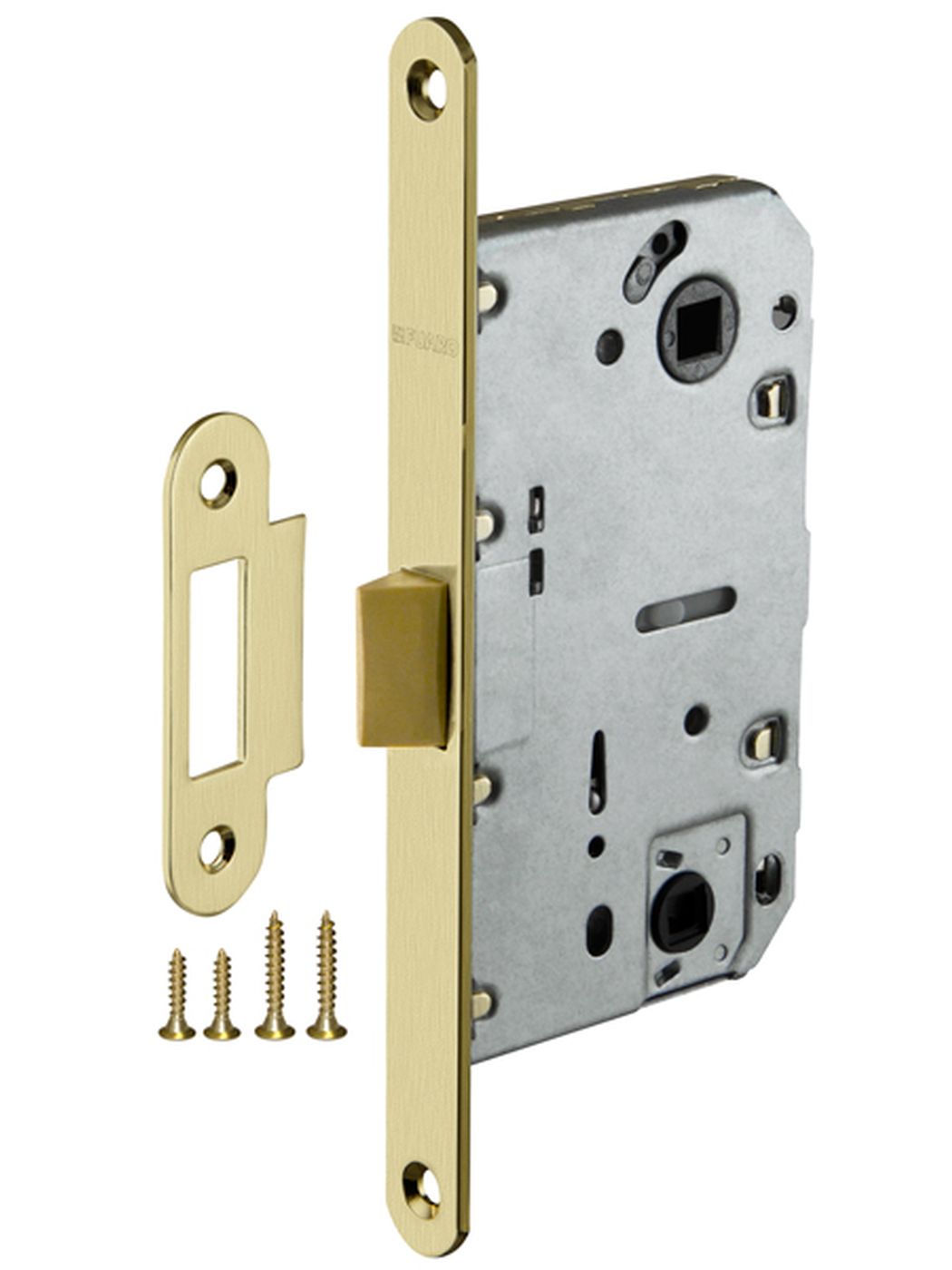 Дверная защелка с пластиковым механизмом Fuaro P96WC серии PLASTIC изготовлена в соответствии с требованиями ГОСТ 5089-2003. Предназначена для установки в деревянные межкомнатные и сантехнические двери. Легкая смена направления язычка защелки, подходит для дверей левого и правого открывания. Корпус выполнен из стали с надежным гальваническим покрытием. Ударопрочный пластиковый механизм обеспечивает бесшумность работы защелки. Защелка P96WC с усиленным блоком пружин имеет высший 4 класс надежности (250 000 циклов открывания/закрывания). Отверстия под стяжные винты находятся на расстоянии 38 мм. Размер бэксета - 50 мм. Размер межосевого расстояния - 96 мм. Возможна установка дверных ручек на стяжные винты для более прочного крепления. Цвет: матовое золото. В комплектацию входят: ответная планка и крепежная фурнитура в цвет изделия.