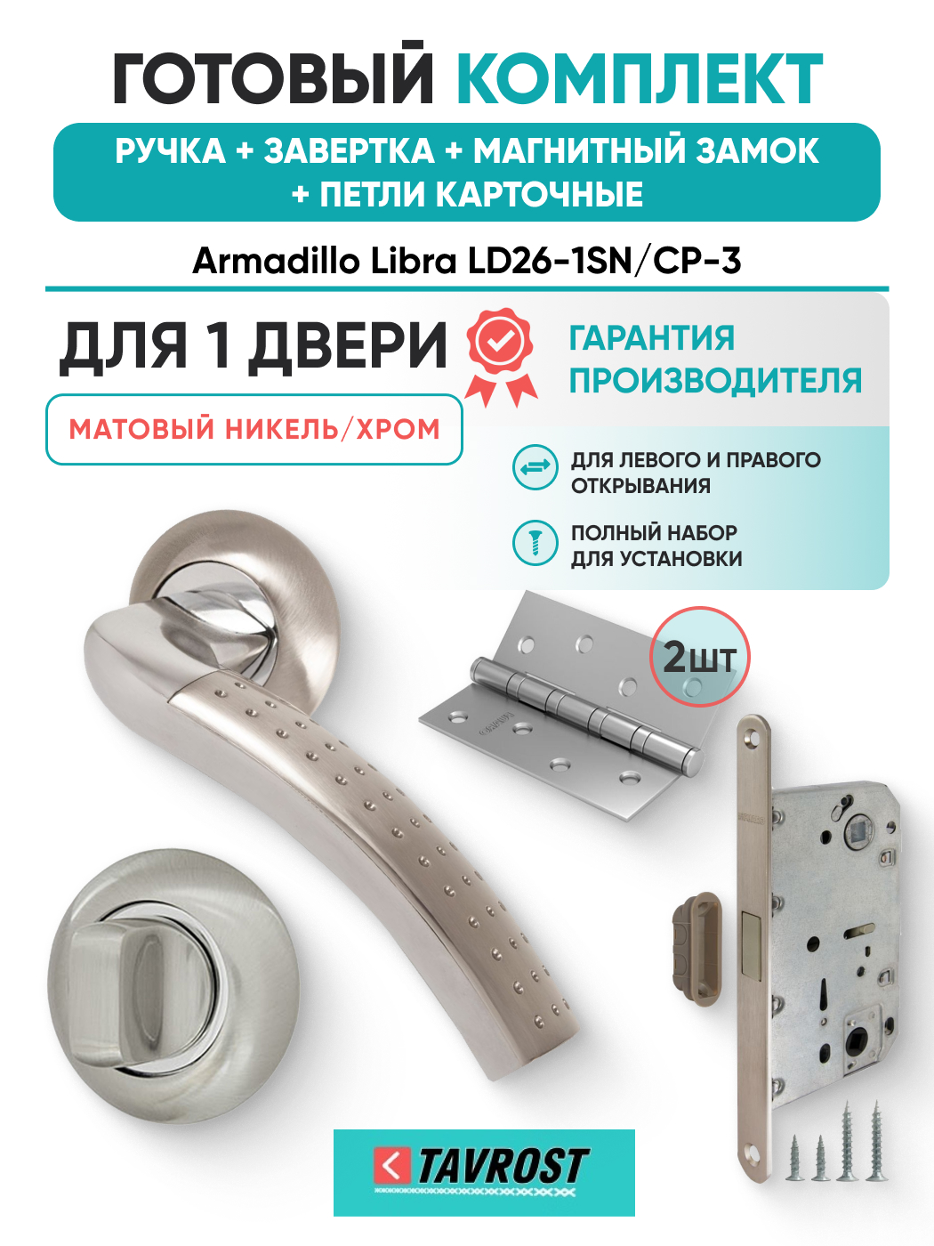 Комплект: Ручки Armadillo Libra LD26-1SN/CP-3+Завертка+Магн замок и Петли Fuaro/матовый никель/хром
