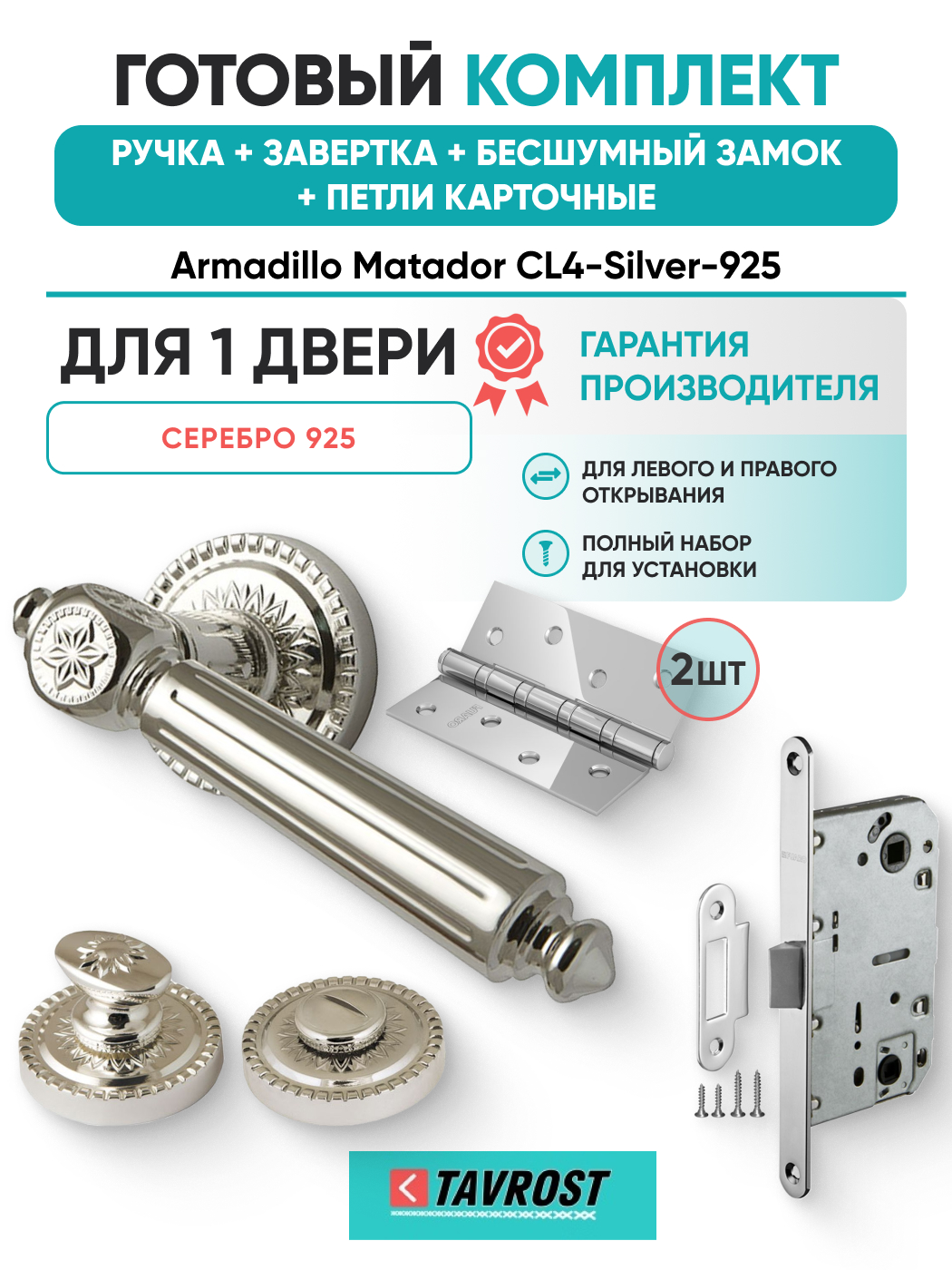 Комплект: Ручки Armadillo Matador CL4-Silver-925+Завертка+Бесшумный замок и Петли Fuaro/серебро 925