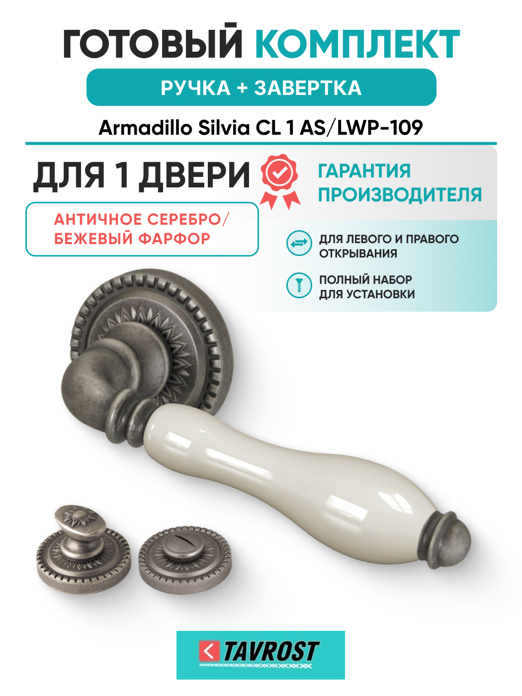 Комплект: Ручки Armadillo Silvia CL 1 AS/LWP-109+Завертка BK6.R.CL55 AS-9/античн серебро/беж Фарфор