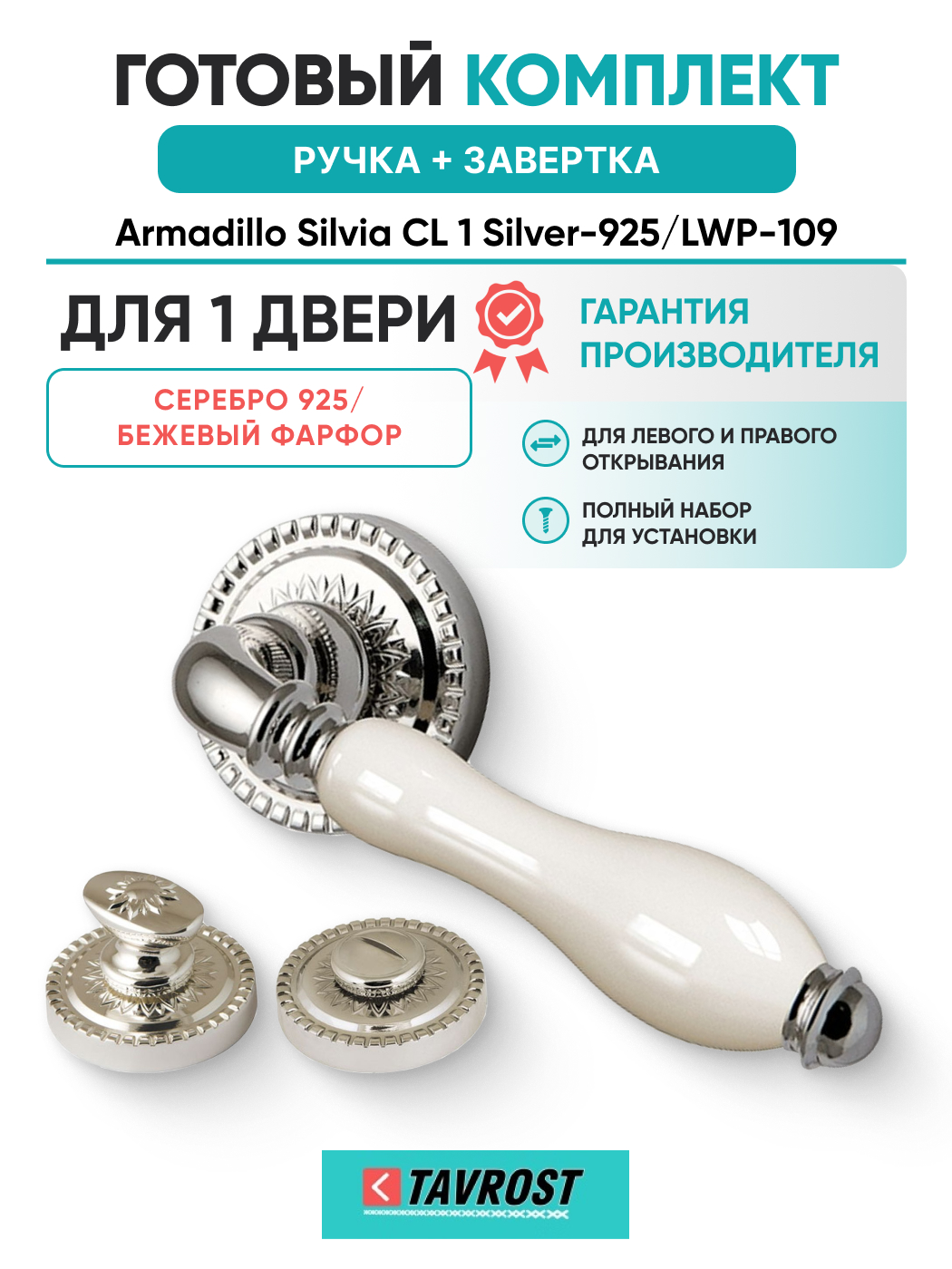 Комплект: Ручки Armadillo Silvia CL 1 Silver-925/LWP-109 + Завертка BK6.R.CL55 SILVER-925 / серебро