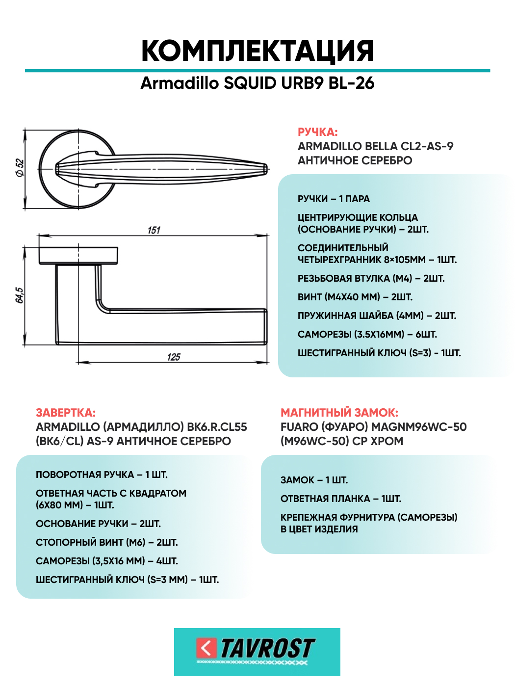 Комплект: Ручки Armadillo SQUID URB9 BL-26+Завертка+Магнитный замок Fuaro/черный