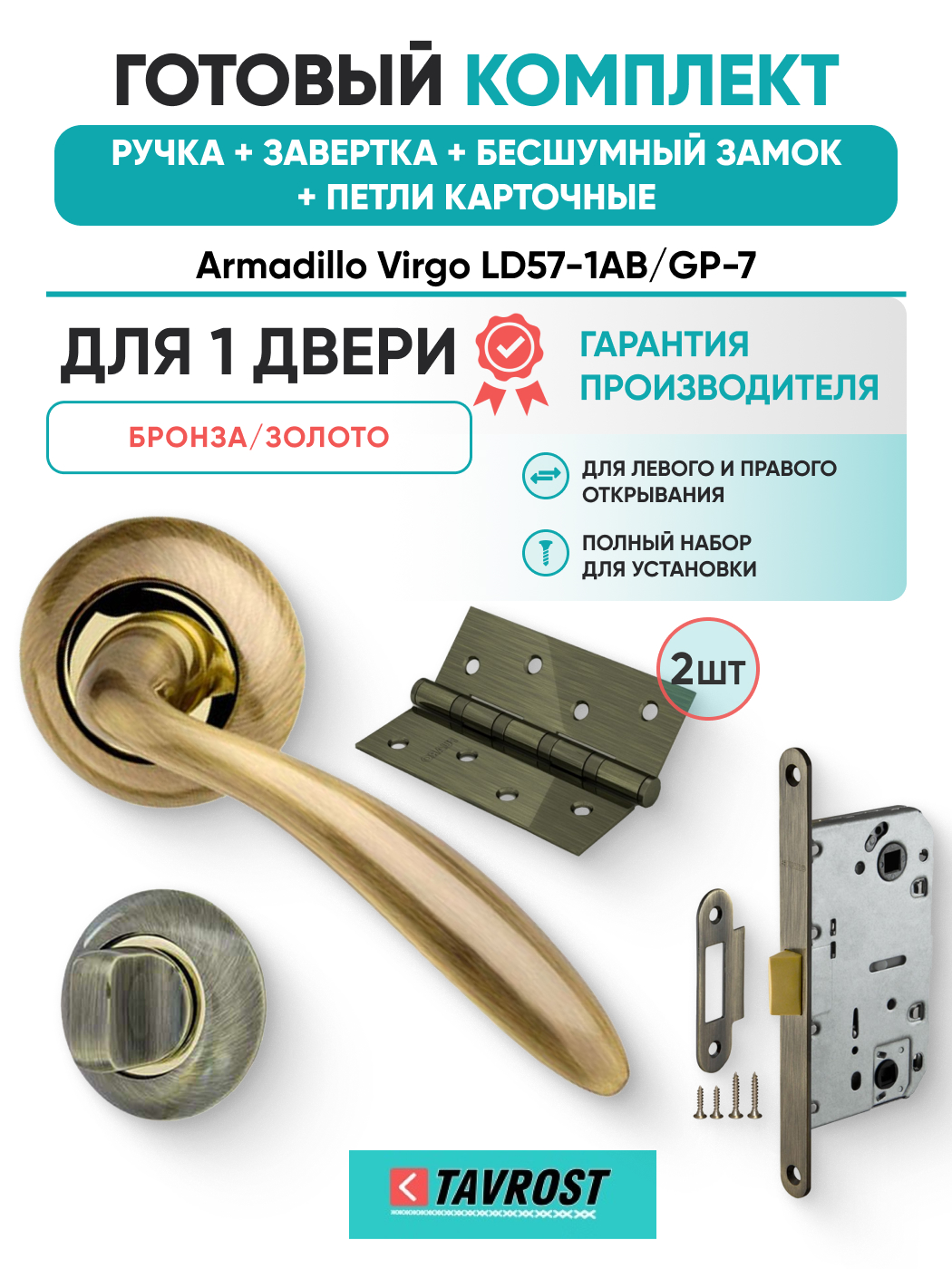 Комплект: Ручки Armadillo Virgo LD57-1AB/GP-7+Завертка+Бесшумный замок и Петли Fuaro/бронза/золото