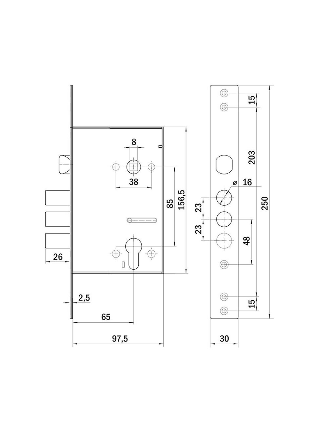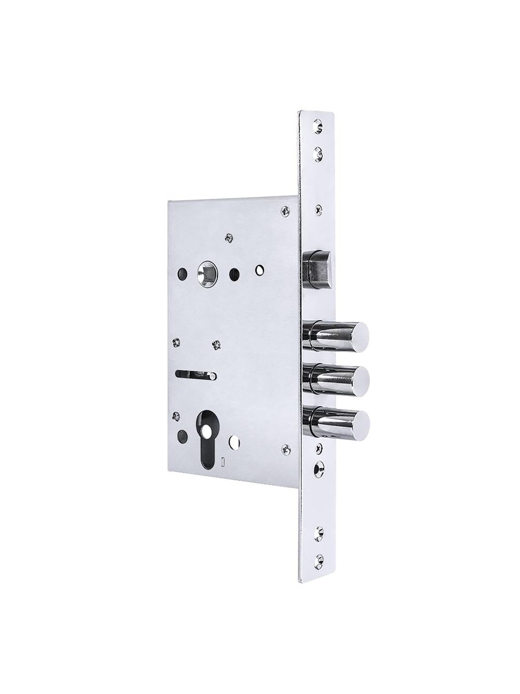 Корпус врезного цилиндрового замка PUNTO с тремя ригелями и защелкой предназначен для установки во входные металлические двери. Стальной оцинкованный корпус. Универсальная реверсивная защелка, подходит для левых и правых дверей. Отверстия под стяжные винты. Бэксет- 65мм. Выход ригелей- 26мм. Межосевое расстояние -85 мм. Диаметр ригелей -16мм. В комплект входит крепежная фурнитура.Характеристики