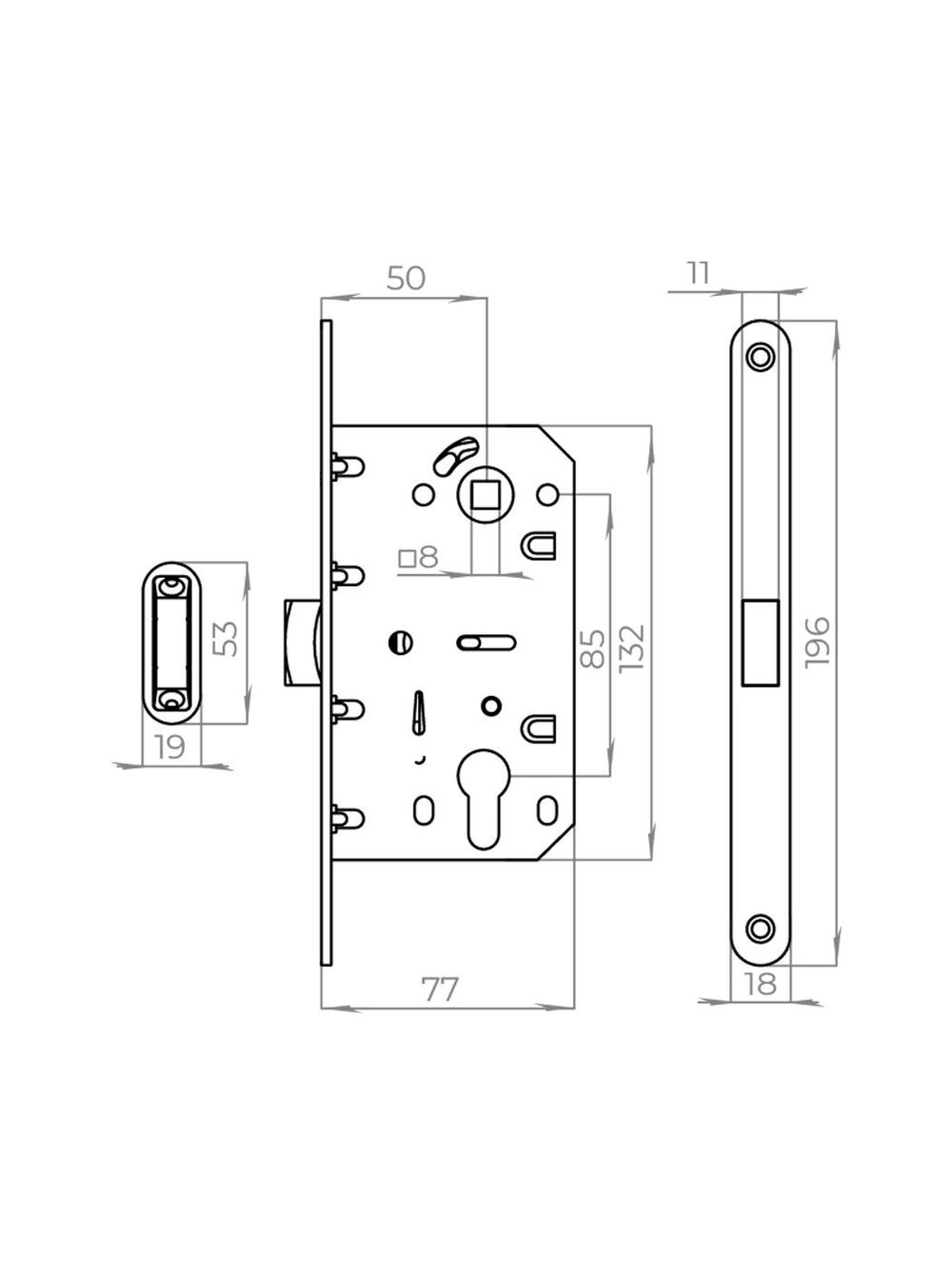 Корпус замка с магнитным механизмом AJAX LN85-50 предназначен для установки в деревянные межкомнатные двери. Подходит для дверей левого и правого открывания. Корпус выполнен из стали.Размер бэксета - 50 мм. Размер межосевого расстояния - 85 мм. Цвет: матовый никель. В комплектацию входят: ответная планка и крепежная фурнитура в цвет изделия.Характеристики