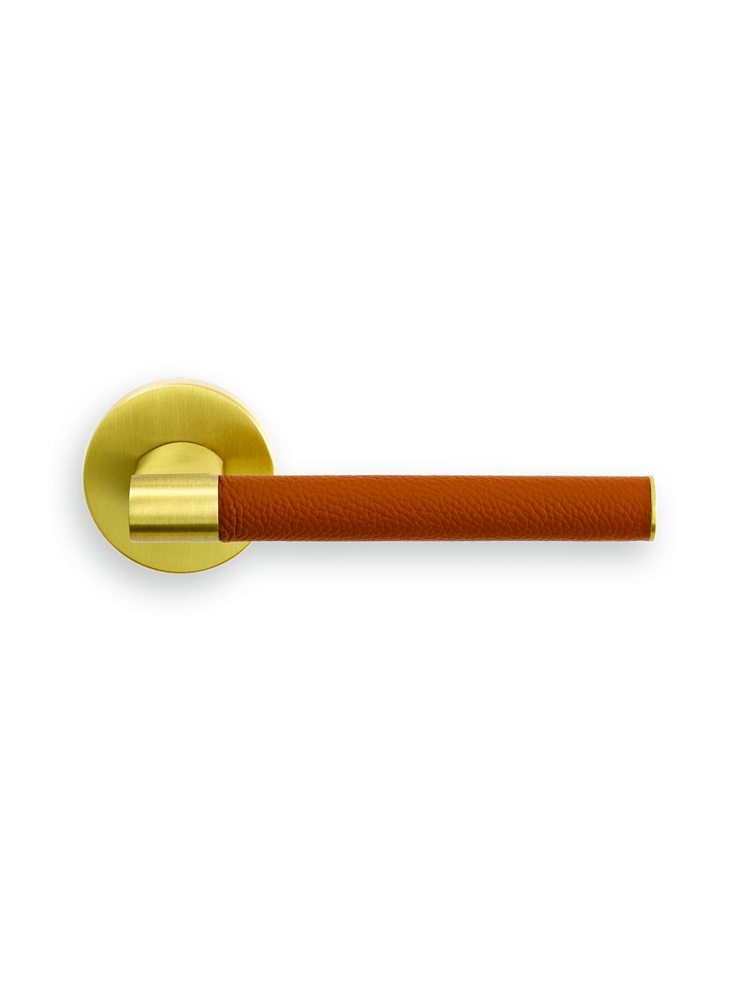 Ручка дверная HIDE LEATHER R6 OSA/Cuoio раздельная на круглой розетке, цвет - матовое золото/светло-коричневый, латунь купить в Москве на официальном сайте Морелли. Полный каталог фурнитуры Morelliс ценами, фото и отзывами. Доставка по России.">