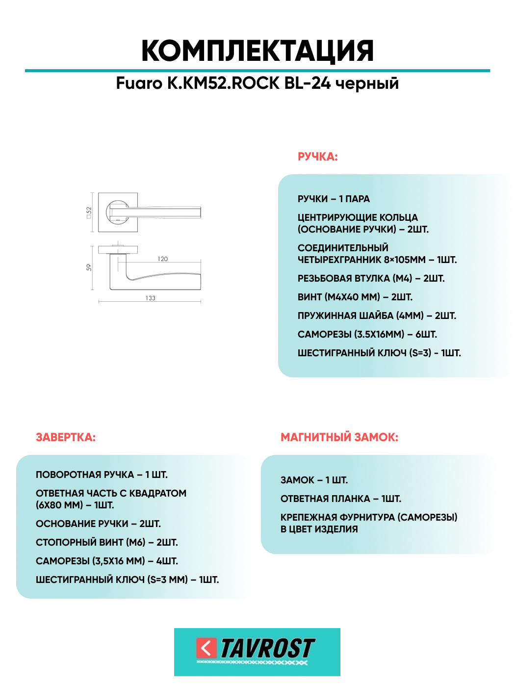 Ручка дверная межкомнатная:Прямые линии, безупречная эргономика и лаконичный дизайн в стиле hi-tech свойственны дверным ручкам серии KM. Дверная ручка на раздельном основании Fuaro ROCK KM на квадратном основании подходит для установки на внутренние входные и межкомнатные двери. Максимальная масса двери 60 кг. Посадочные размеры оснований совместимы со всеми типами межкомнатных механизмов. Материал изготовления: ZAMAK (сплав цинка, алюминия, магния и меди). Гальваническое покрытие прошло тест на устойчивость к коррозии в соляном тумане - более 96 часов. Ресурс работы дверных ручек более 150 000 циклов открывания/закрывания, что гарантирует безотказную работу двери более чем на 10 лет. Стяжные винты в комплекте обеспечивают более прочное крепление на полотне двери, подходят для установки на двери толщиной 35-55 мм. В комплект входят: стяжные винты, соединительный квадрат 8x105 мм, саморезы, фиксирующие винты, шестигранник.