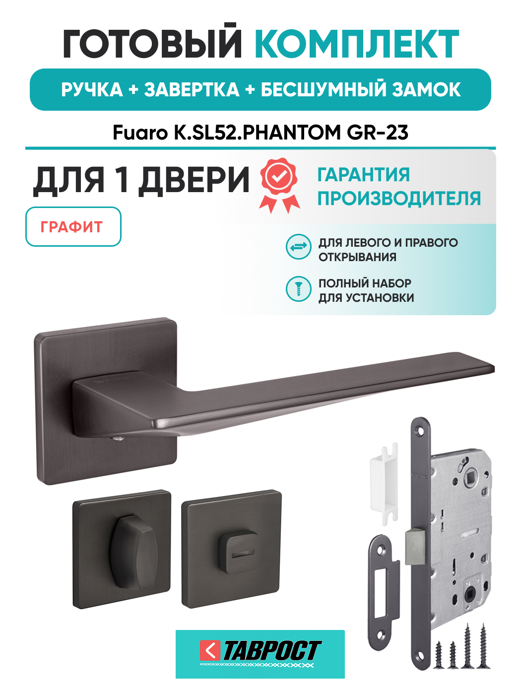 =this.property.NAME_2 (страна производства Китай , тип конструкции: ), выпускается в заводских условиях, с соблюдением всех технологических требований производства и контролем на всех этапах производства. Ручка изготовлена из материала , который широко используется при производстве дверной фурнитуры, в цвете графит. Ручки выполнены в стиле , Комплекты, что придаст межкомнатным дверям свою индивидуальность. Ручки продаются комплектами и подходят для дверей левого и правого открывания. В комплекте содержится полный набор для установки на одну дверь (соединительный штифт, шурупы и т.д). Размеры ручки: длина , ширина , высота . Вся продукция производителя Фуаро обладает проверенным временем качеством, подкрепленным заводской гарантией.
