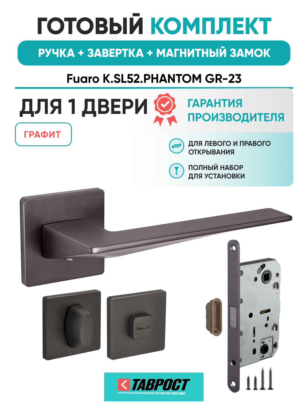 =this.property.NAME_2 (страна производства Китай , тип конструкции: ), выпускается в заводских условиях, с соблюдением всех технологических требований производства и контролем на всех этапах производства. Ручка изготовлена из материала , который широко используется при производстве дверной фурнитуры, в цвете графит. Ручки выполнены в стиле , Комплекты, что придаст межкомнатным дверям свою индивидуальность. Ручки продаются комплектами и подходят для дверей левого и правого открывания. В комплекте содержится полный набор для установки на одну дверь (соединительный штифт, шурупы и т.д). Размеры ручки: длина , ширина , высота . Вся продукция производителя Фуаро обладает проверенным временем качеством, подкрепленным заводской гарантией.