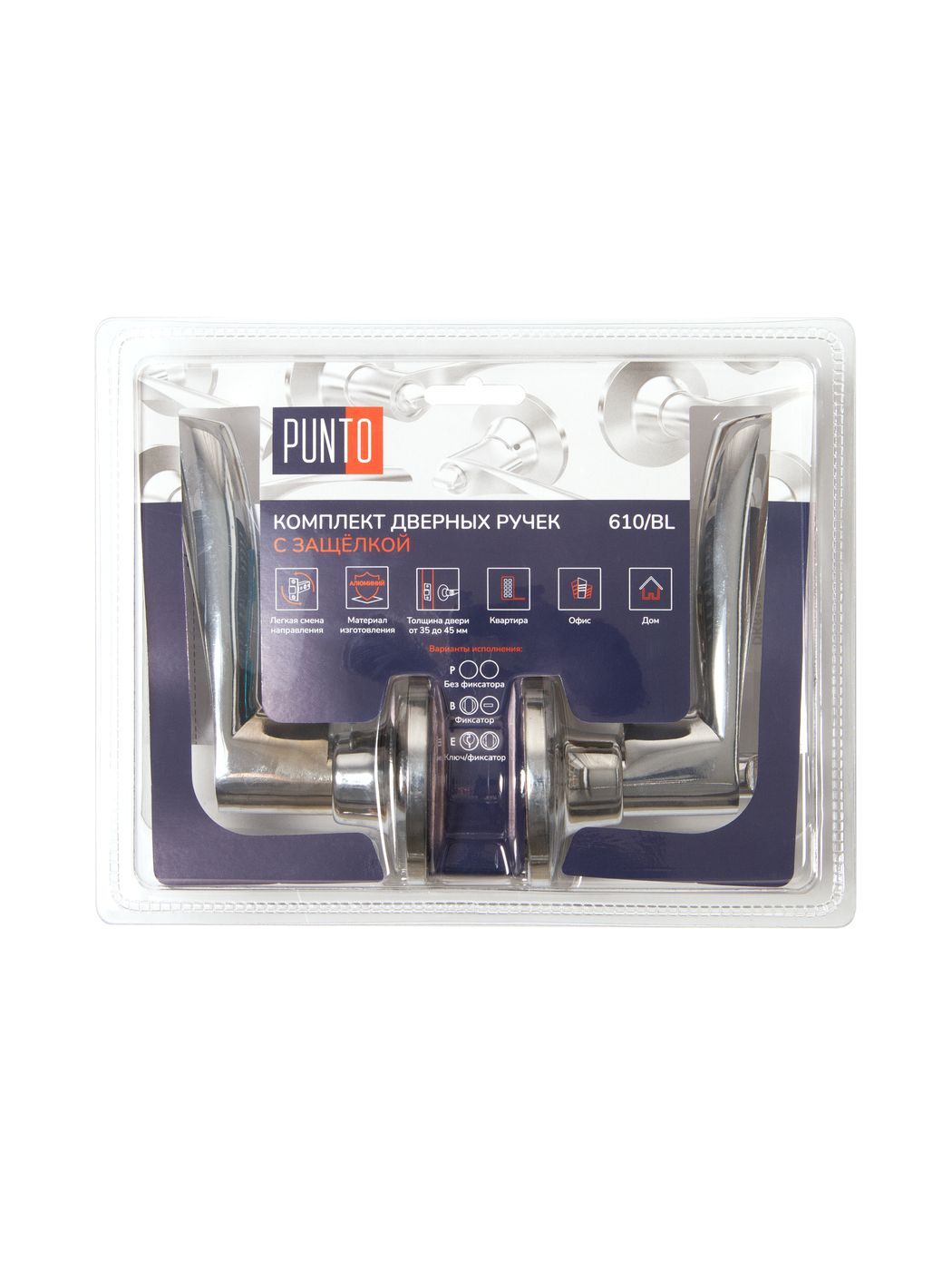 Комплект дверных ручек с защелкой (KNOB) Punto предназначен для установки в межкомнатные двери толщиной 35-45 мм. Подходит для дверей правого и левого открывания. Гальваническое покрытие прошло тест на устойчивость к коррозии в соляном тумане и соответствует 1 классу ГОСТ. Бэксет защелки регулируется - 60/70 мм. Материал изготовления: сталь. Комплектация: защелка, ответная планка с декоративной заглушкой, дверные ручки, крепежная фурнитура, шаблон и инструкция по установке.