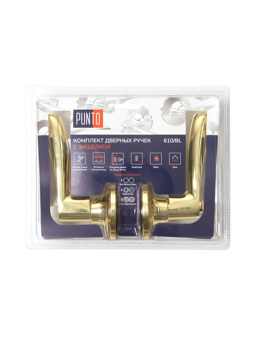 Комплект дверных ручек с защелкой (KNOB) Punto предназначен для установки в межкомнатные двери толщиной 35-45 мм. Подходит для дверей правого и левого открывания. Гальваническое покрытие прошло тест на устойчивость к коррозии в соляном тумане и соответствует 1 классу ГОСТ. Бэксет защелки регулируется - 60/70 мм. Материал изготовления: сталь. Комплектация: защелка, ответная планка с декоративной заглушкой, дверные ручки, крепежная фурнитура, шаблон и инструкция по установке.
